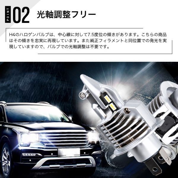 【光軸調整フリー】H4のハロゲンバルブは、中心線に対して7.5度位の傾きがあります。こちらの商品はその傾きは再現されています。また純正フィラメントと同位置での発光を実現していますので、バルブでの光軸調整は不要です。切れのいいカットライン、HIDより瞬時に立ち上がり、明るく、快適、安全なドライビングをお楽しみください。面倒な光軸調整、固定工具作業等は必要ございません。 ※ご注意※ ハロゲンを極力再現した汎用バルブになります。H4は、光軸フリーの為、装着は車両側に依存する形となります。その為、一部の車種では傾きや台座を削るといった加工が必要になる場合がございます。照射についても、車両側のリフレクターの反射位置に依存するため、一部の車種では光軸や配光が合わない場合がございます。(その際は、車両側での調整が必要になります)
