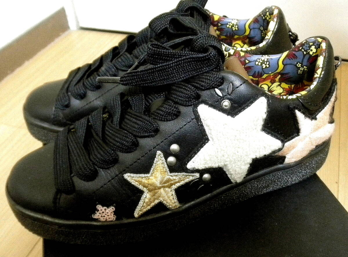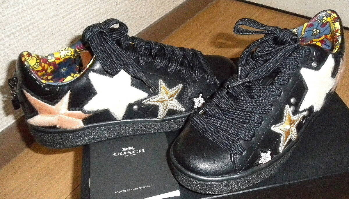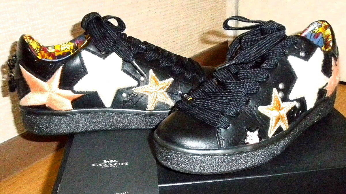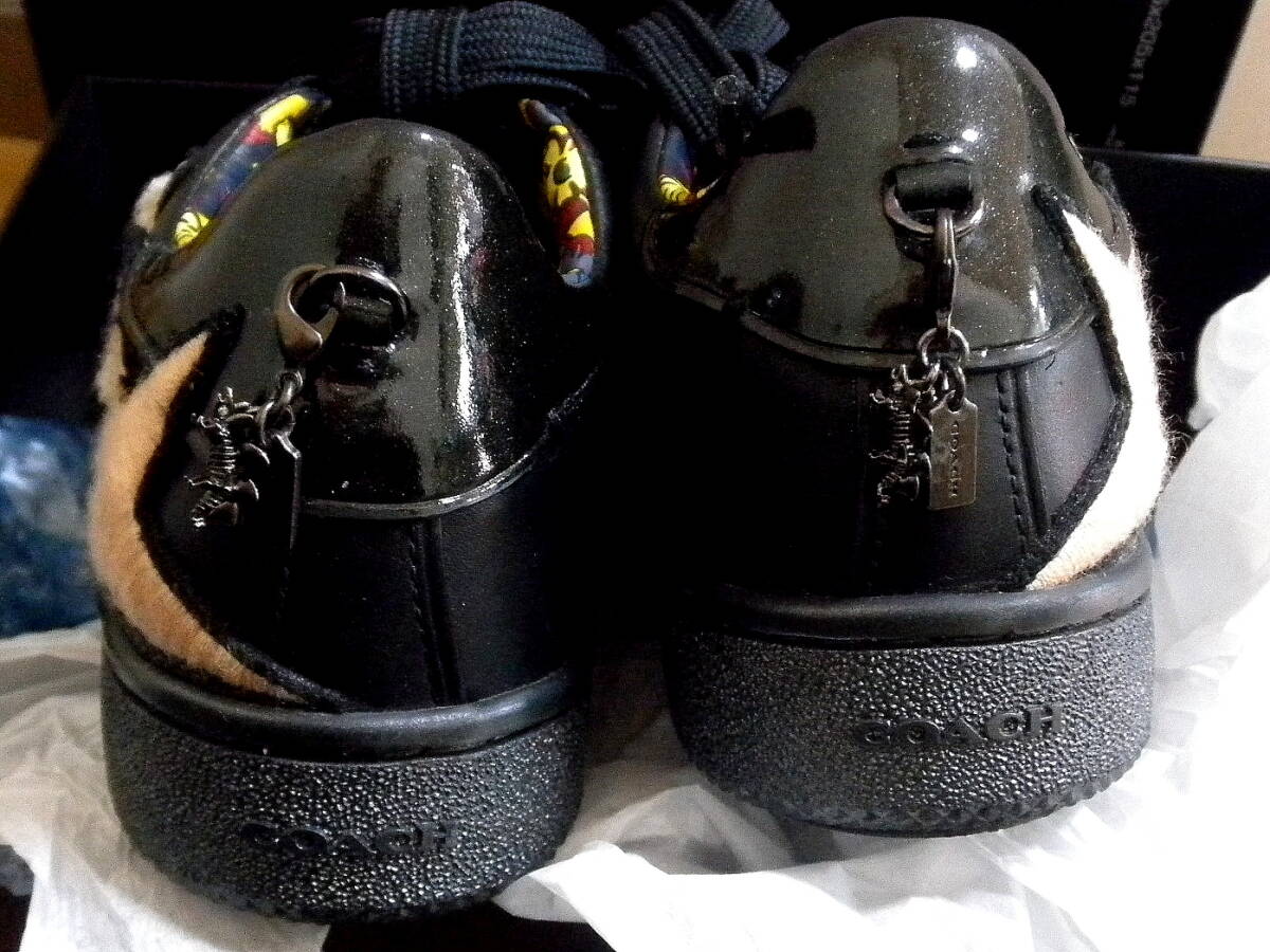 未使用 即決 コーチ COACH 5B 21-22㎝ レキシー ワッペン パッチワーク スニーカー スリッポン 靴 黒 革 レザー 恐竜 新品 展示品