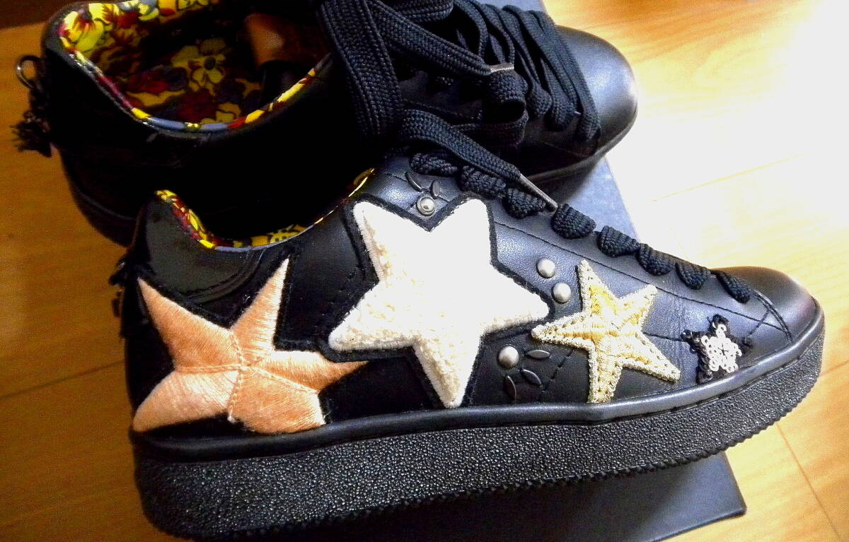 ・黒革。パッチワークは刺繍やパイルの様ないろいろな生地、色、素材を使用。スタッズ、スパンコールの装飾も。