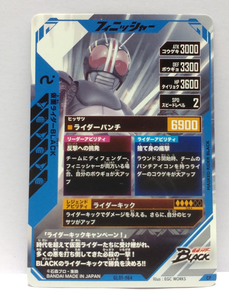 「仮面ライダーバトル ガンバレジェンズGL1弾 仮面ライダーBLACK(CP GL01-064) ブラック ライダーキック」を出品します。「おまとめ」可能な方は4枚までミニレター送料85円でお取扱いできます。5枚以上の場合は定形郵便で送料別途計算となります。