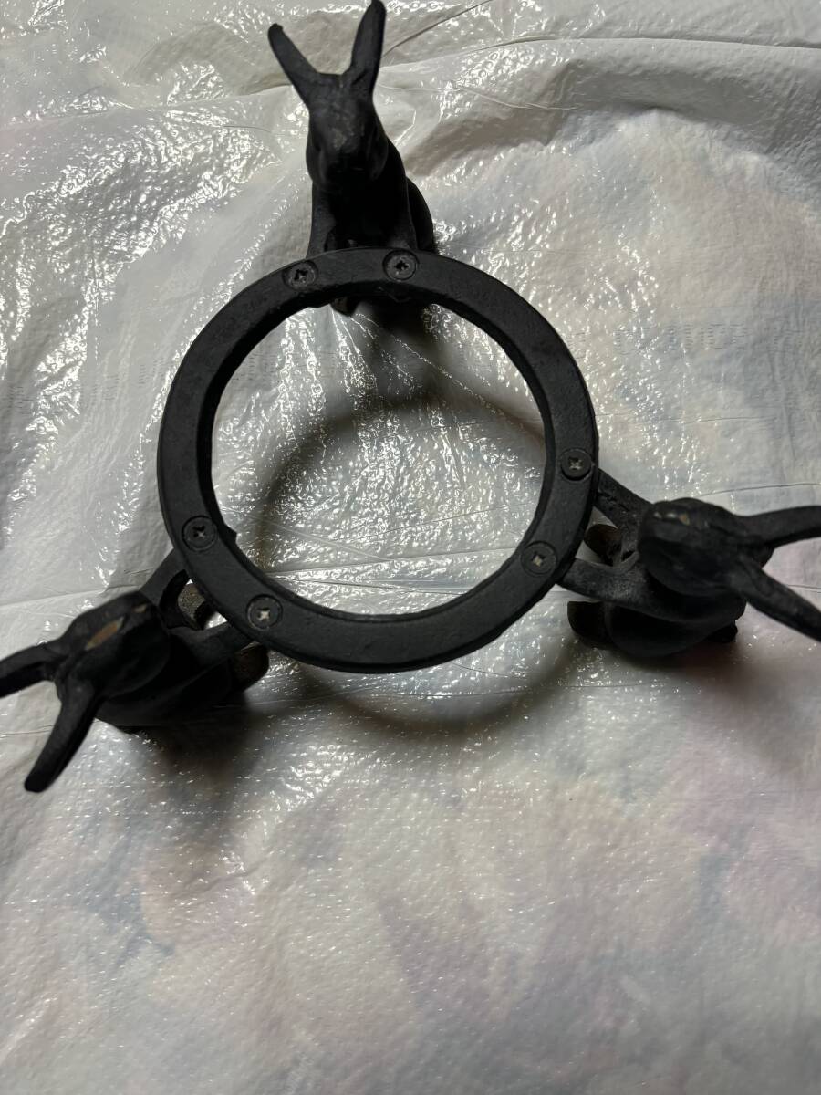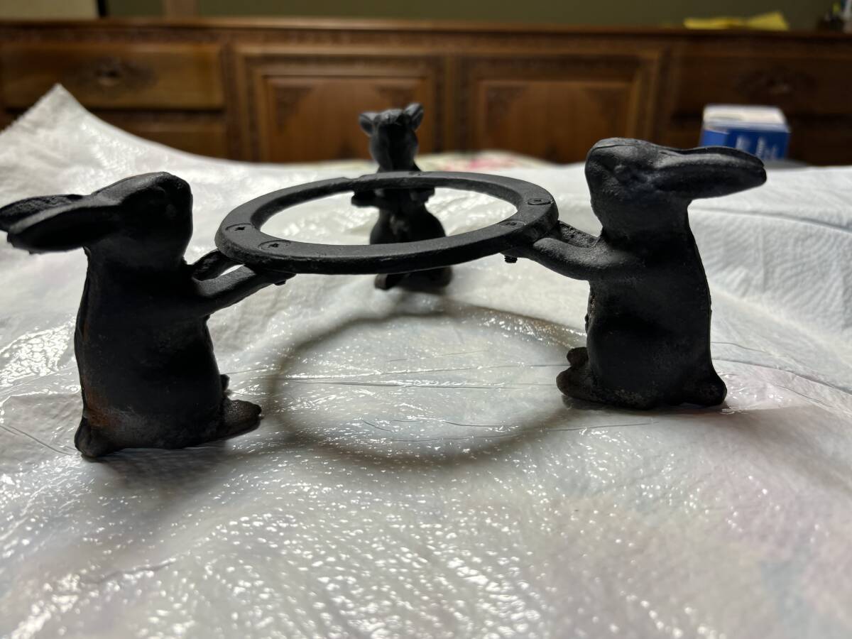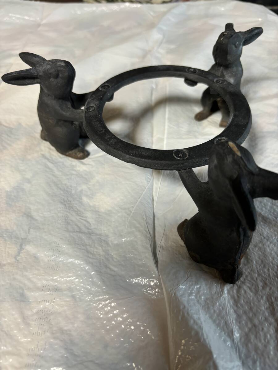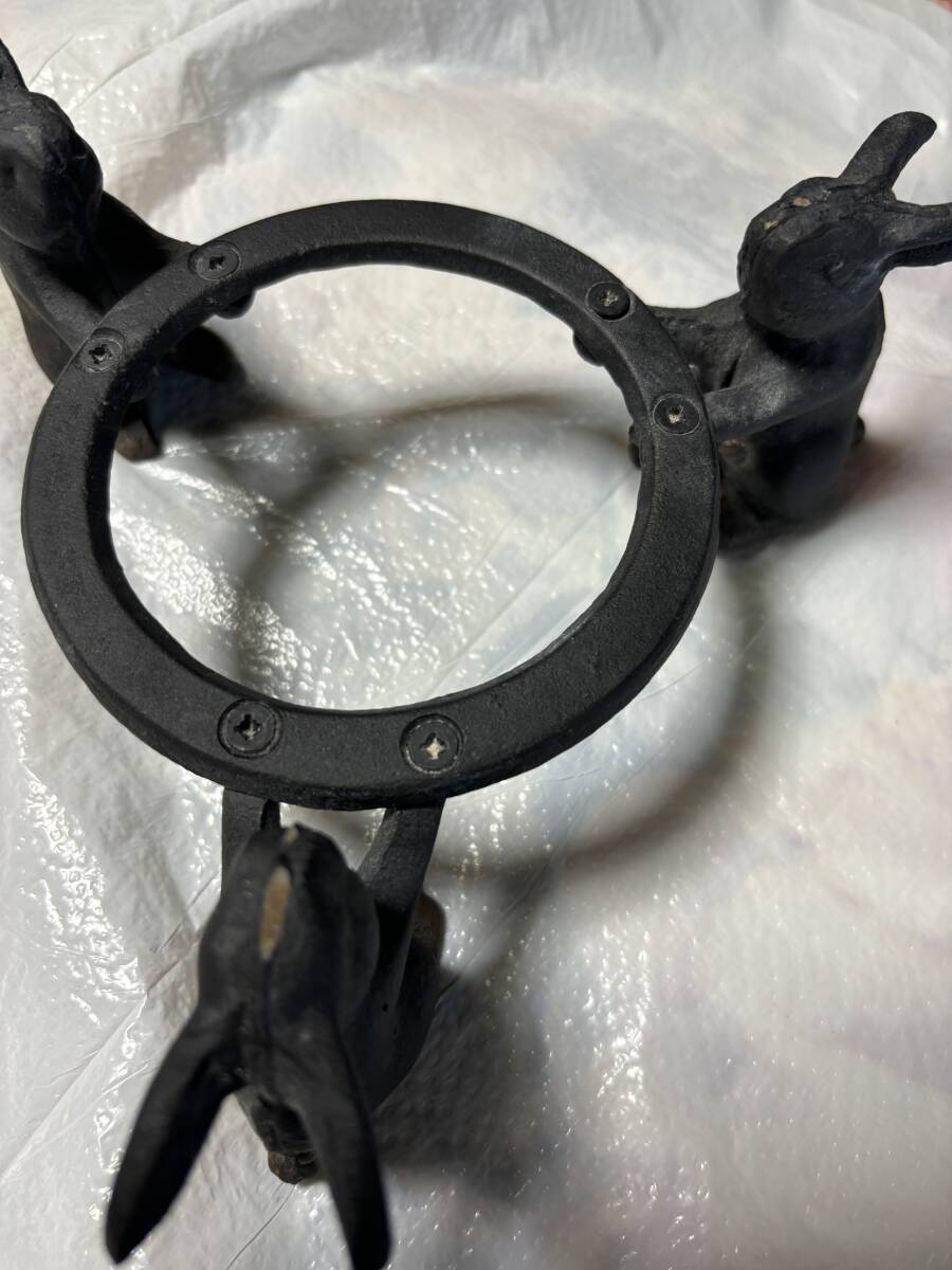 鋳鉄の炉用の五徳です。ほとんど使っていませんが、一部錆が出てきています。 ウサギと台座は一体の鋳造ではなく、組み立てられています。 内部の円の輪っかの直径が110mmで、ウサギの頭から頭まで125mmぐらいです。ウサギの頭までの高さが70mm,輪っかまでの高さが55mmとなっています。