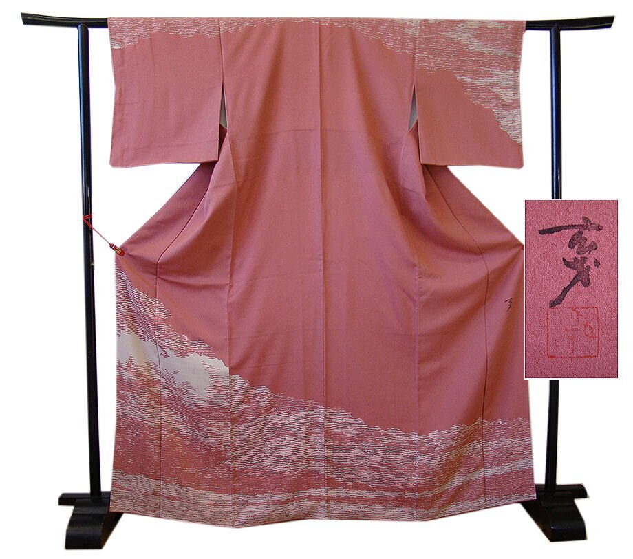 商品説明 | こちらのお品は「袷」ですので10月から5月までお召頂ければと思います。 とてもしなやかで柔らかな手触りの滑らかな着心地良い重めの極上ちりめん地の生地、 渋い長春色地に灰白色の染柄、 八掛は灰茶色(正絹)、作家「玄才」の落款入り、幅広い年代の方にお召し頂けます。 |