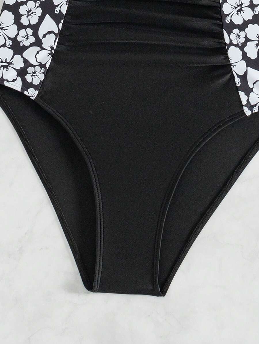 レディース 水着 ワンピース 夏のビーチ用 ランダムプリント プリーツ コントラストカラー ワンピース水着