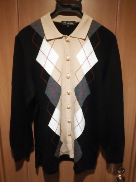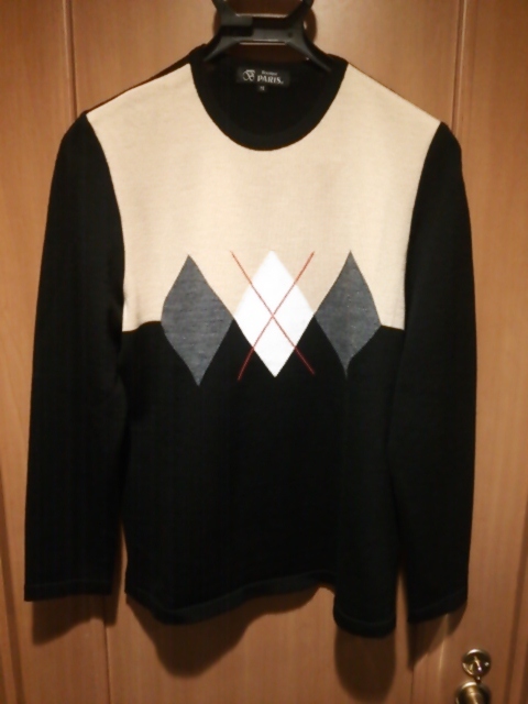 ブラック、ベージュ、ホワイト等のアーガイルデザイン、程よい厚みの、滑らかなメリノ系ハイゲージウール。