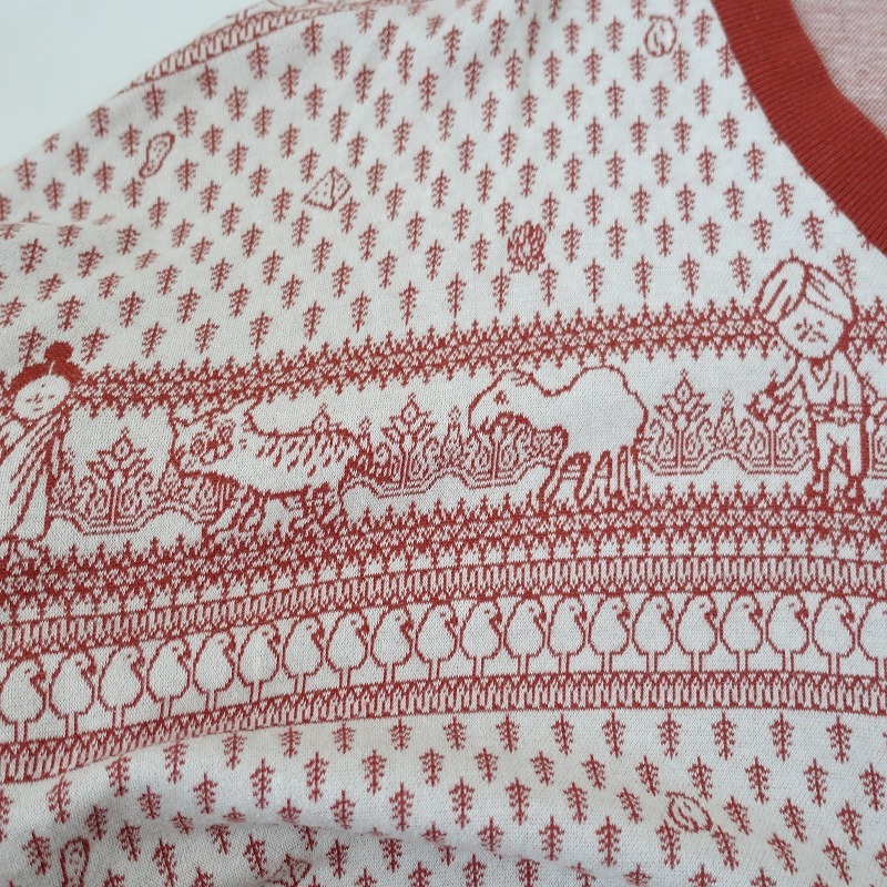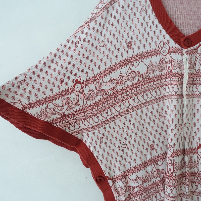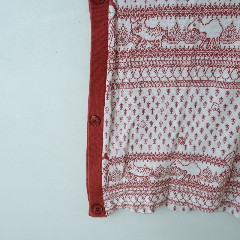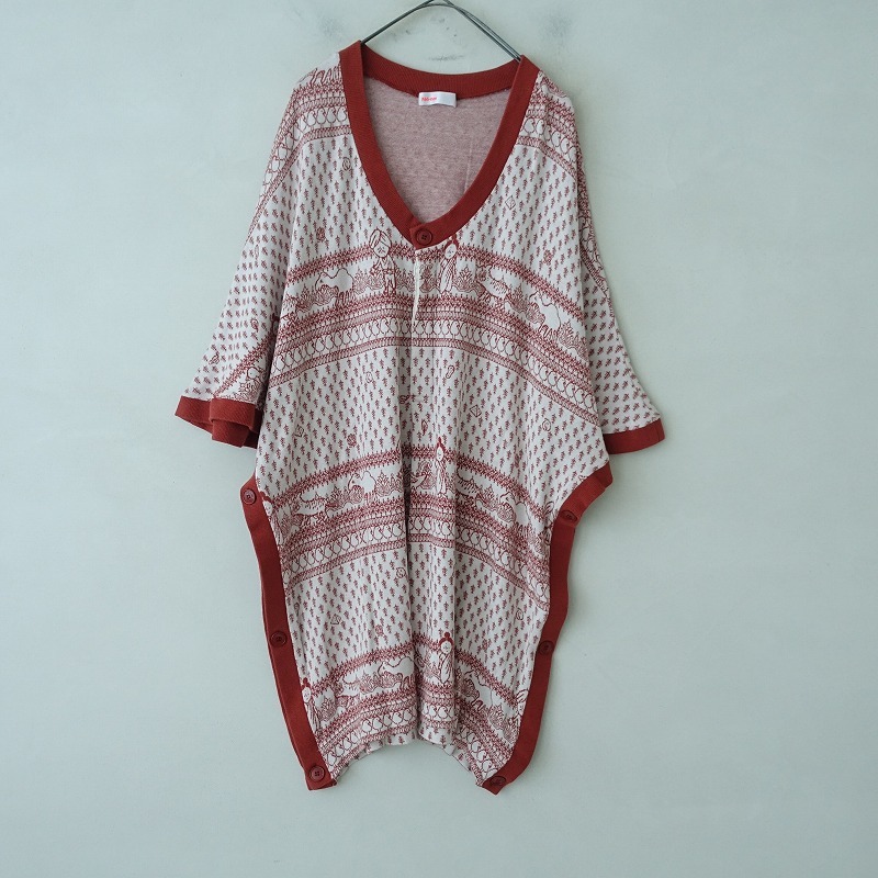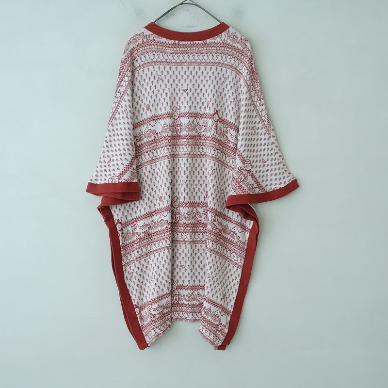 Ne-netのジャカードニットポンチョプルオーバーです。カラーはエビチャ×オフホワイトです。コットンのジャカードニットを使用。大きく開いたVネックのプルオーバーで、胸元は比翼ボタン仕様、前立ての下にタックが施されております。両サイドは3個のボタン留めです。ボタンはブランドネームが刻印されたオリジナルボタンを使用。ポケットはございません。 |