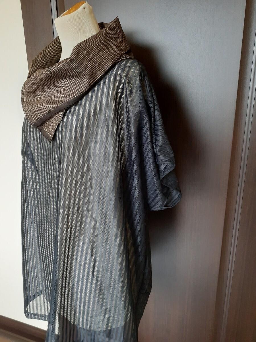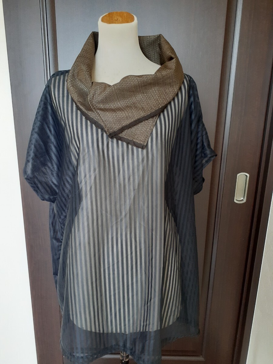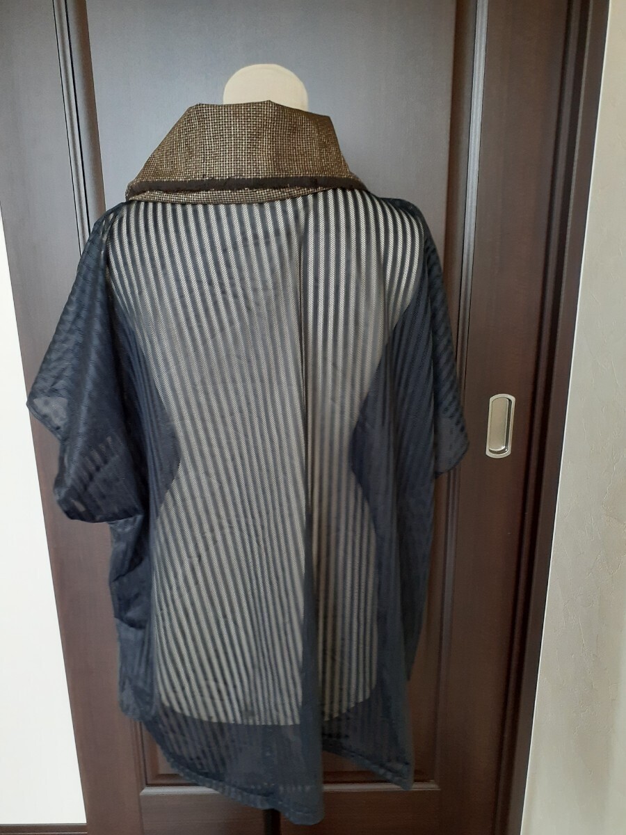 大きいサイズのチュニックです。新反のメッシュ素材の透け感のあるブラックフォーマル地と泥大島の着物を解いて襟に加えたハンドメイド品になります。大きさは、身幅68、総丈70になります。