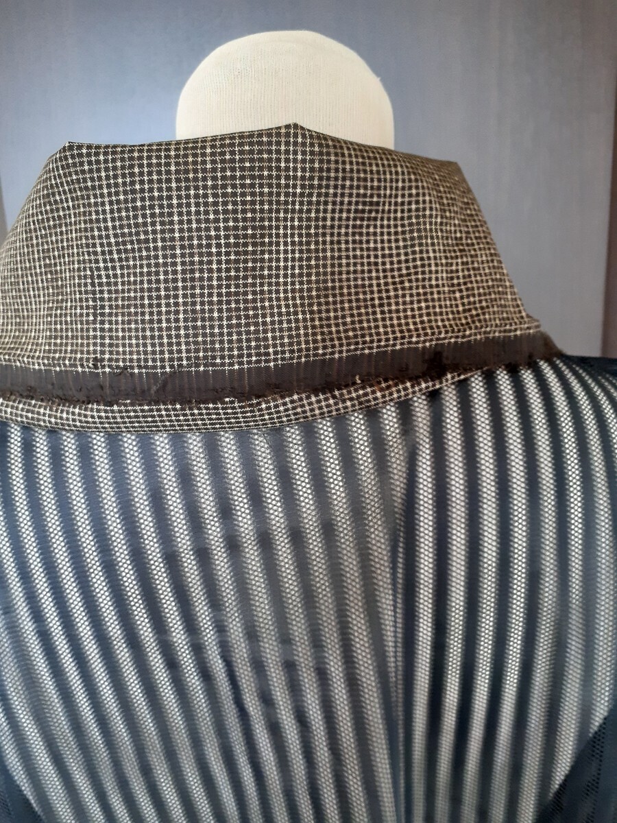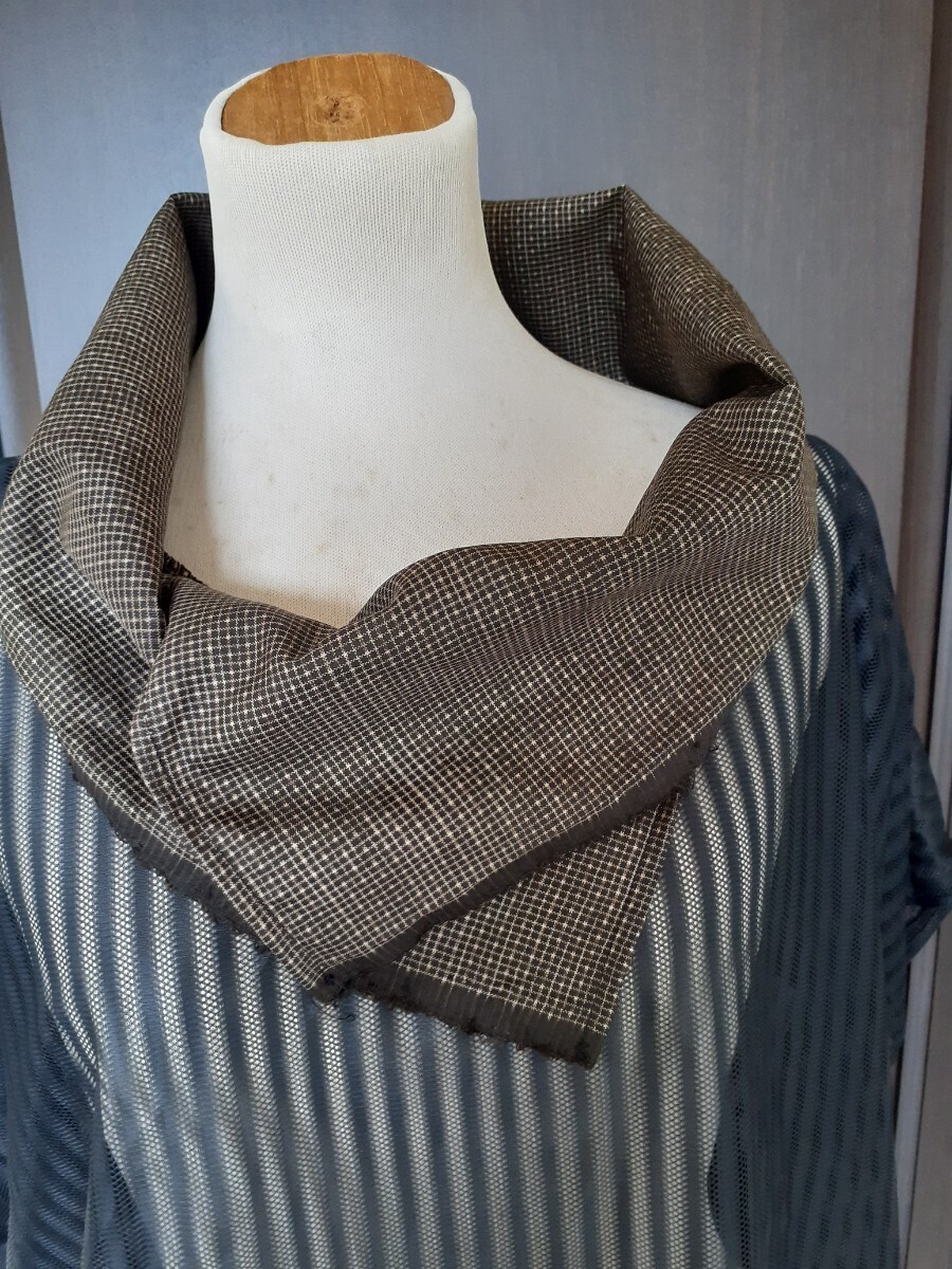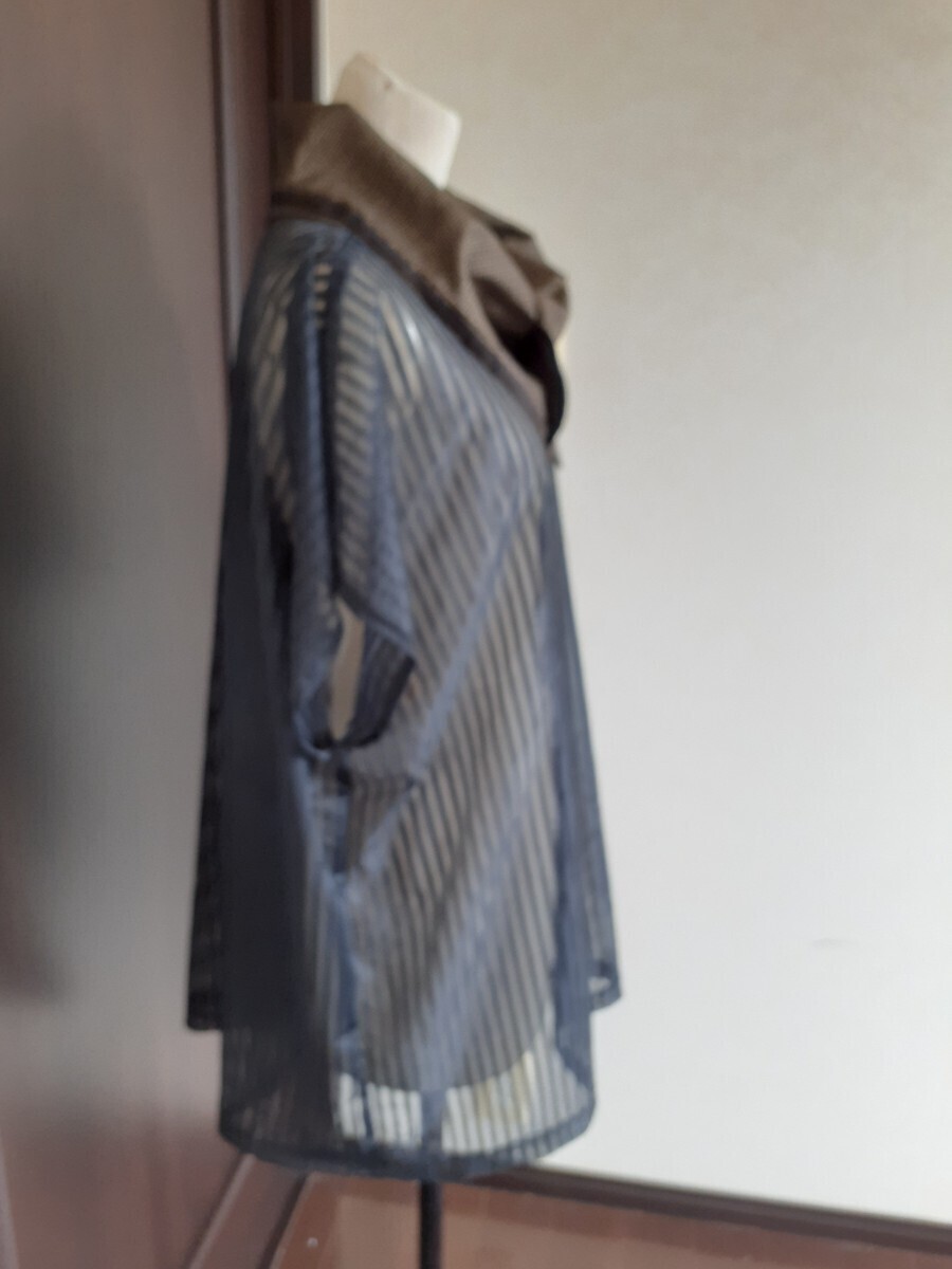 大きいサイズのチュニックです。新反のメッシュ素材の透け感のあるブラックフォーマル地と泥大島の着物を解いて襟に加えたハンドメイド品になります。大きさは、身幅68、総丈70になります。