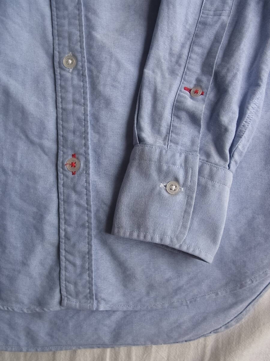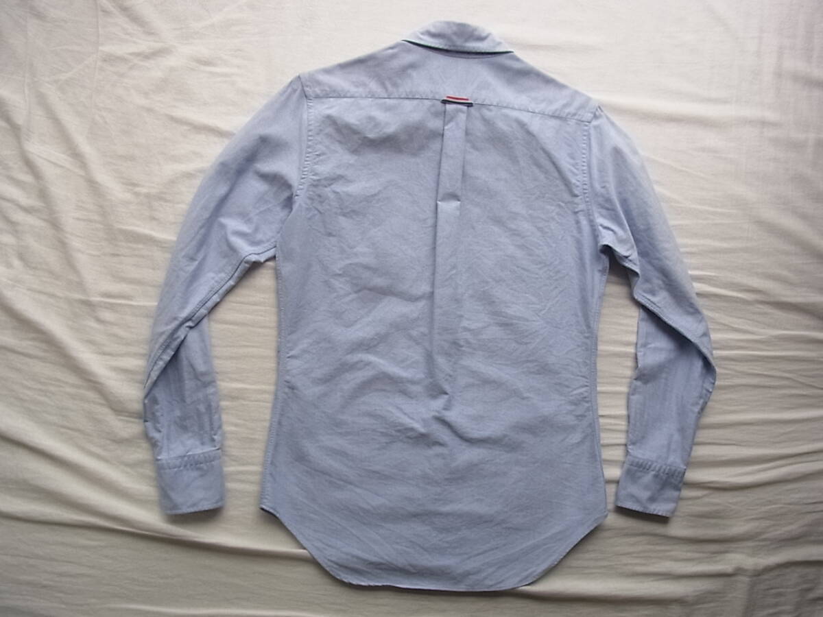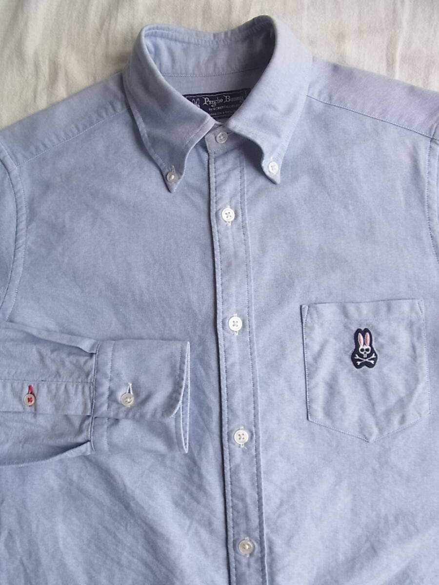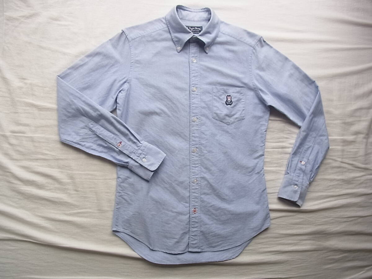 サイコバニーのコットンオックス素材のボタンダウンシャツになります。USEDで着用感と、衿部分に薄く汚れは御座いますが、それ以外には特に目立ったダメージ等は御座いません。