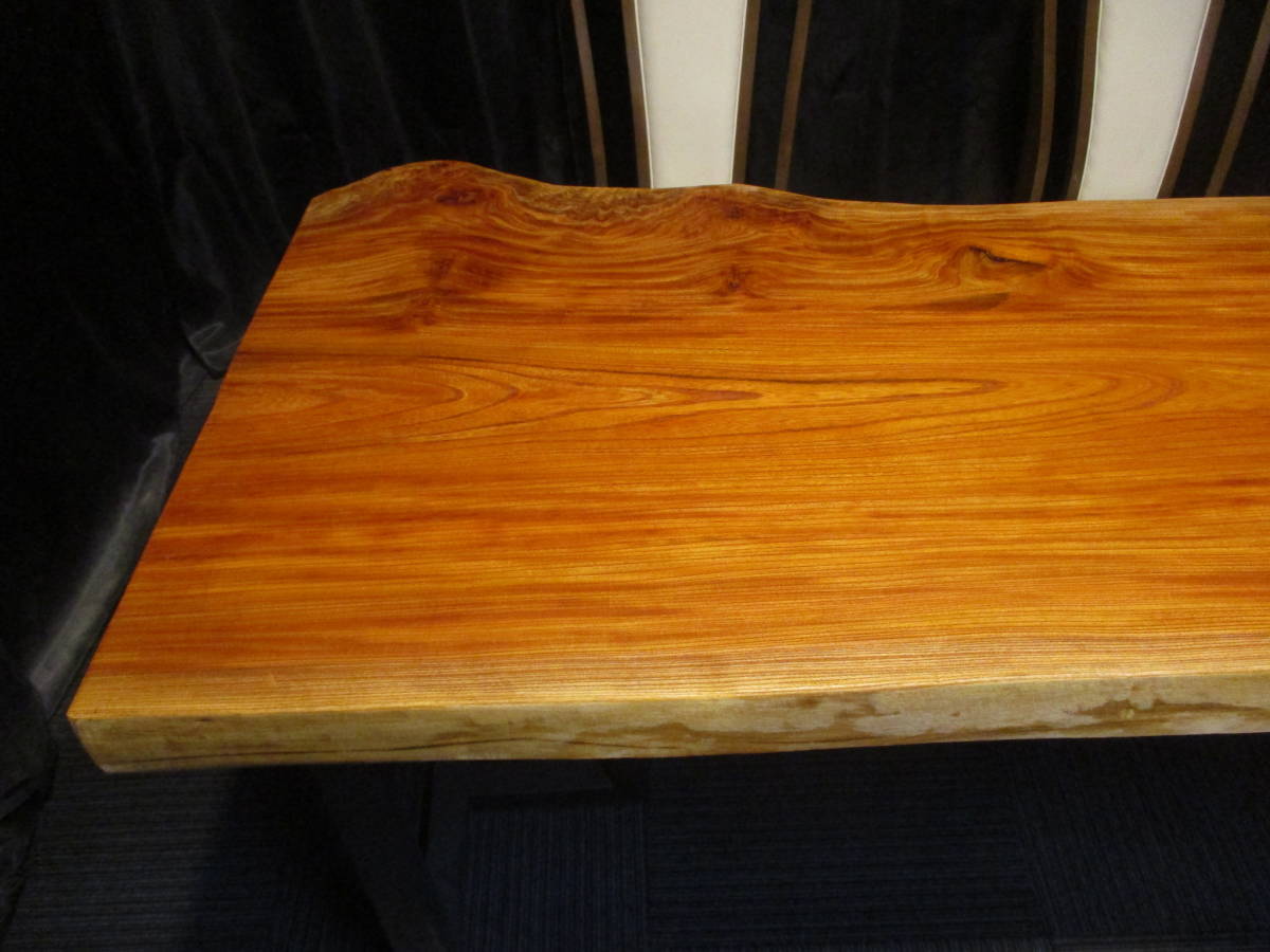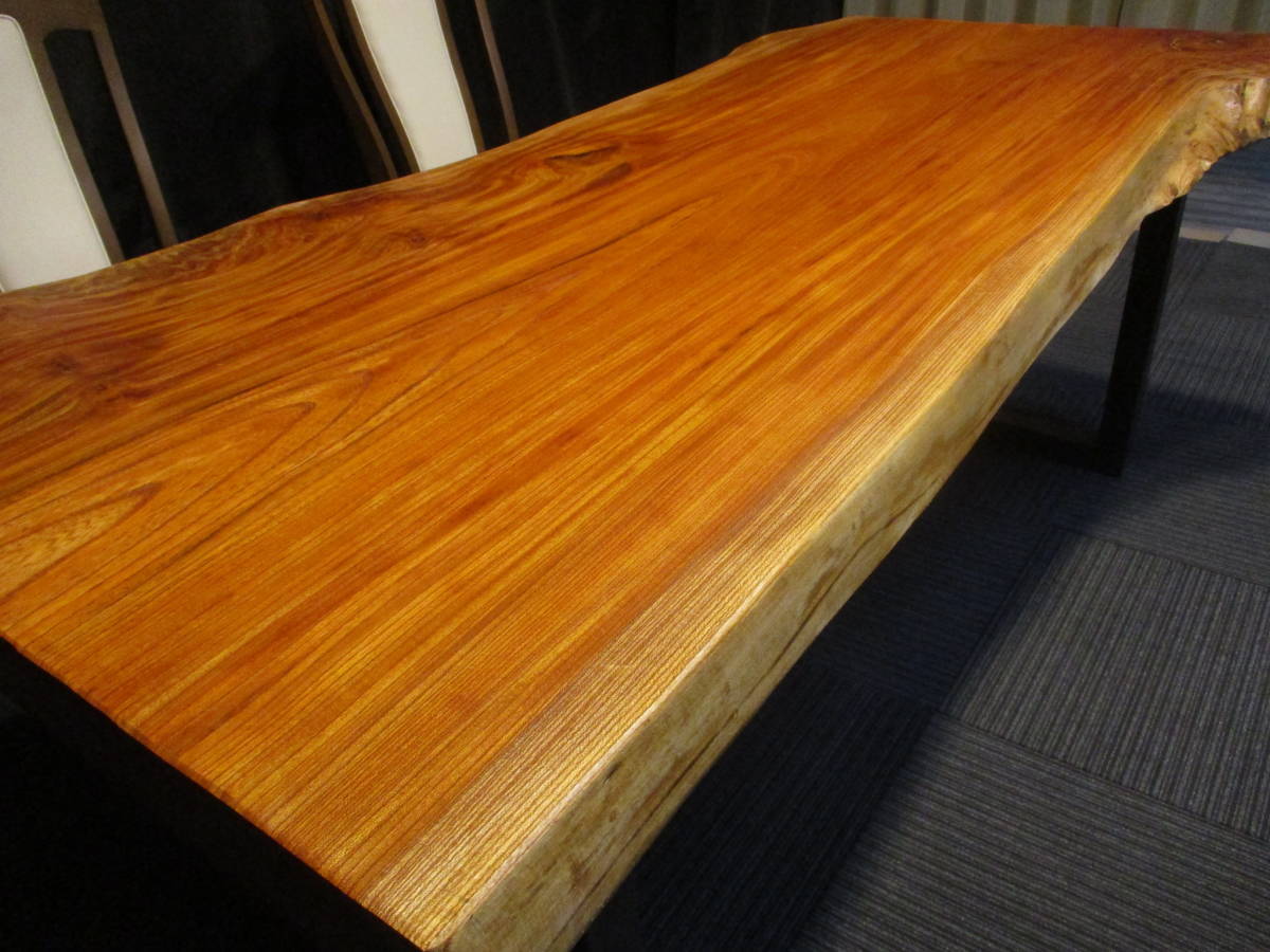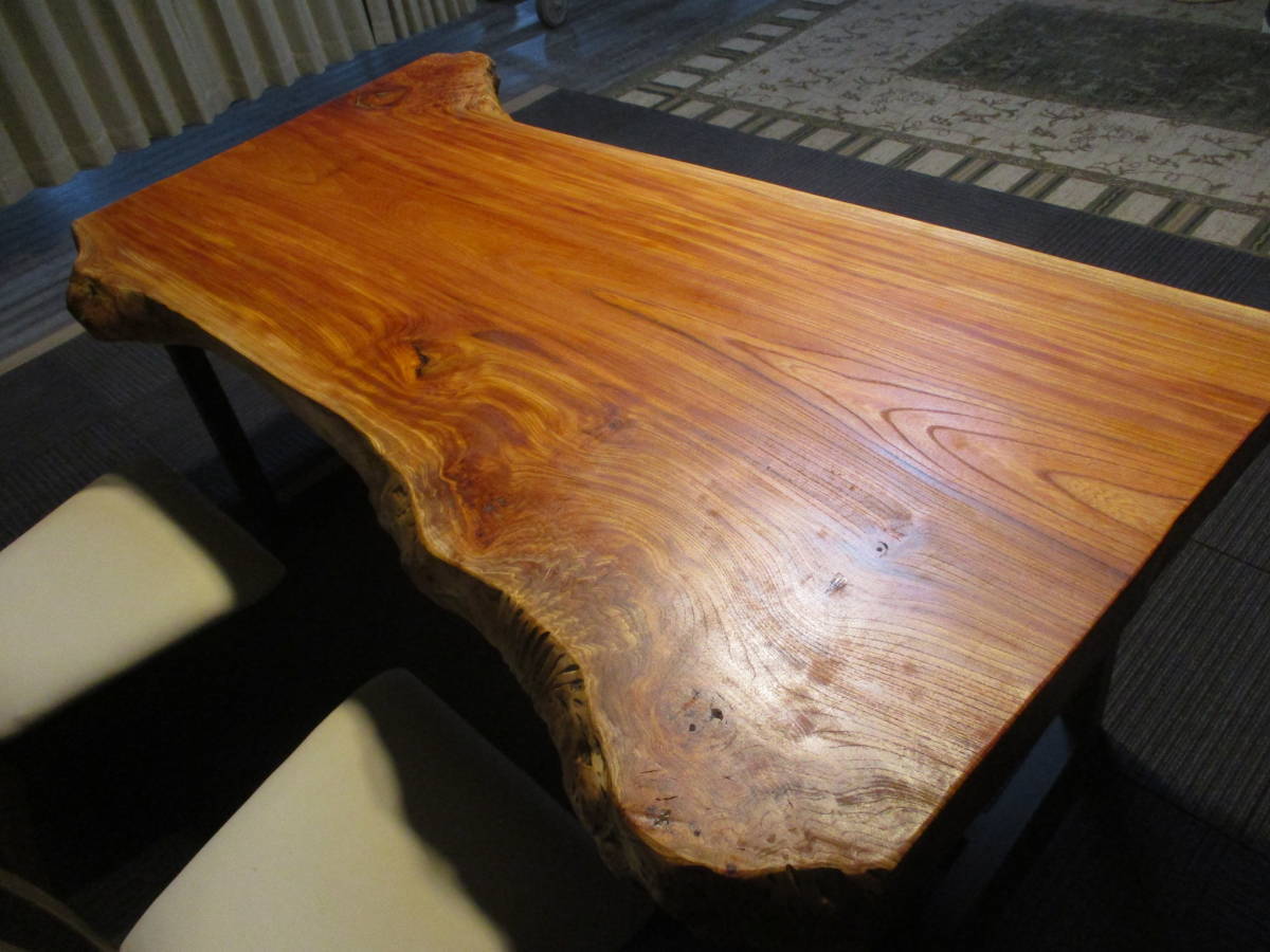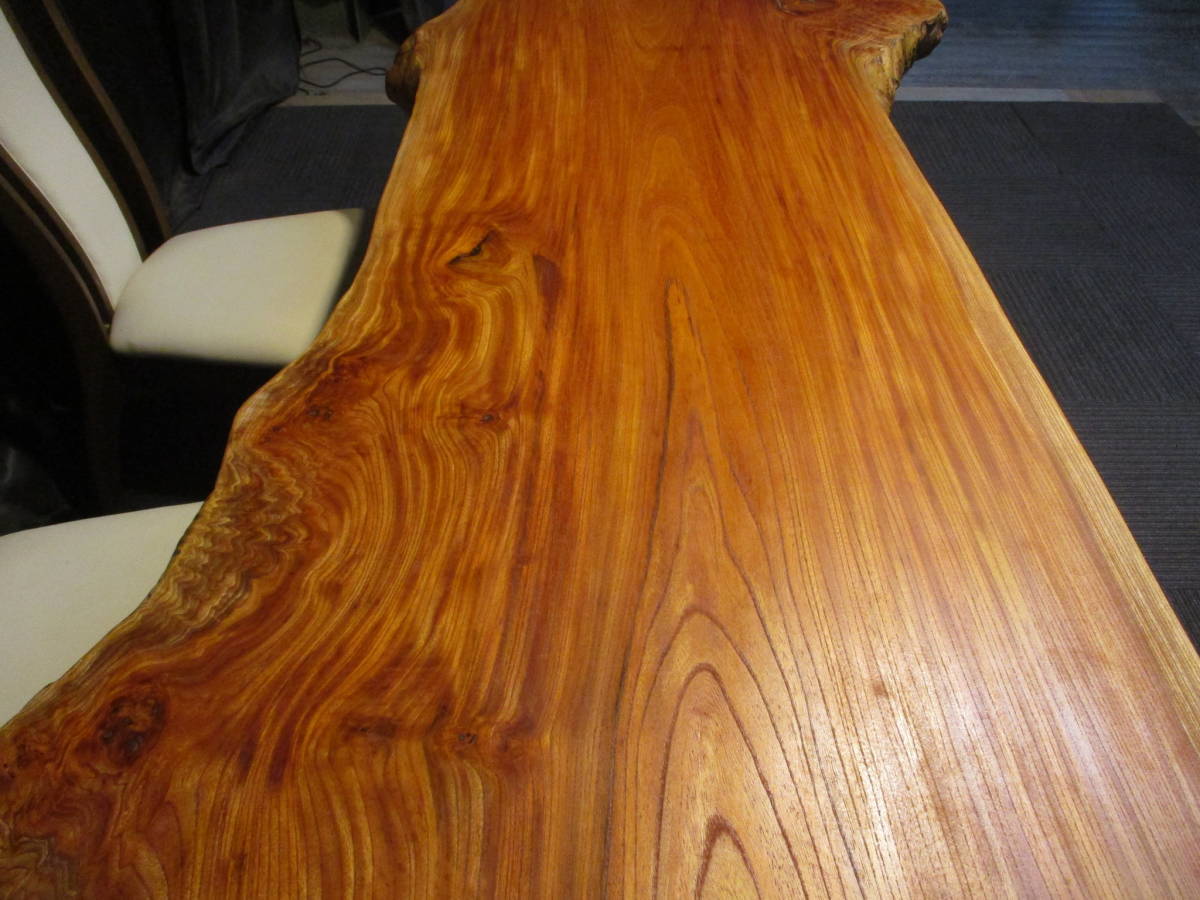 人気商品の紅欅の一枚板新品テーブルです。欅の力強いパワーを感じます。大きな節がポイントです。厚みもあります。