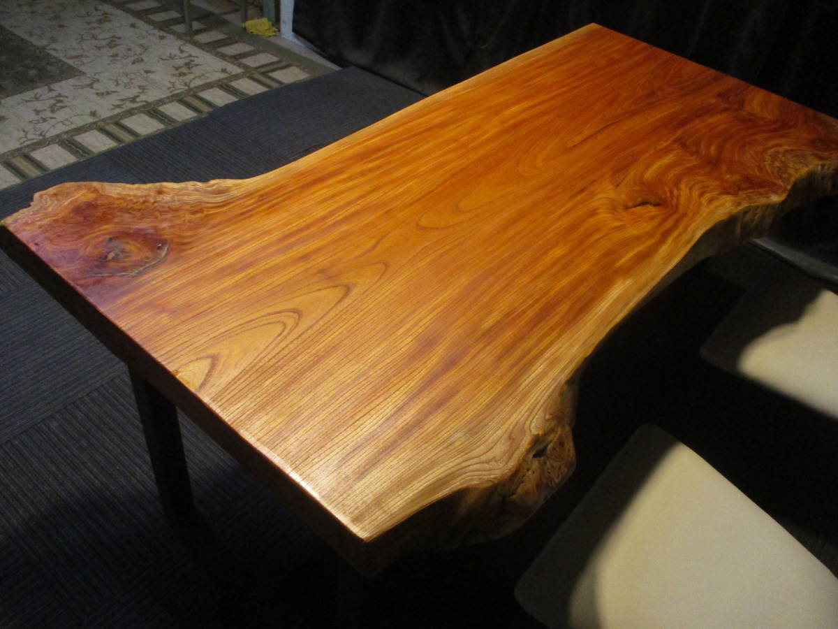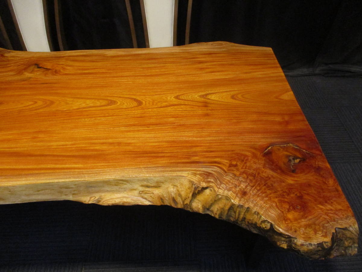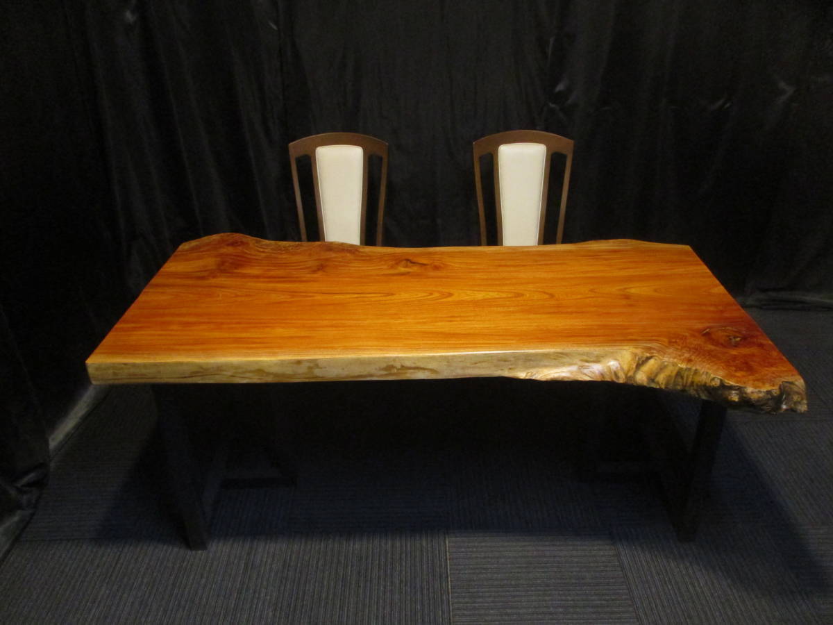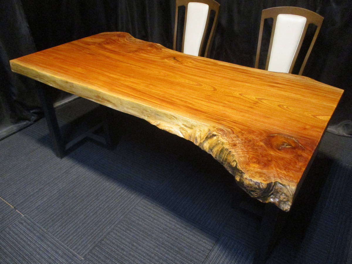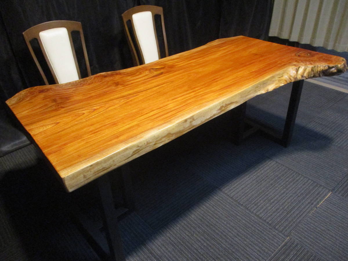 人気商品の紅欅の一枚板新品テーブルです。欅の力強いパワーを感じます。大きな節がポイントです。厚みもあります。