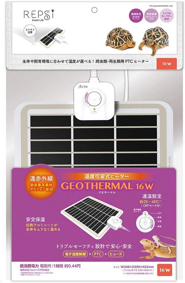 生体や飼育環境に合わせて約25~45℃の範囲で温度が選べる、飼育容器の外から暖める爬虫類・両生類用ヒーター。16W。