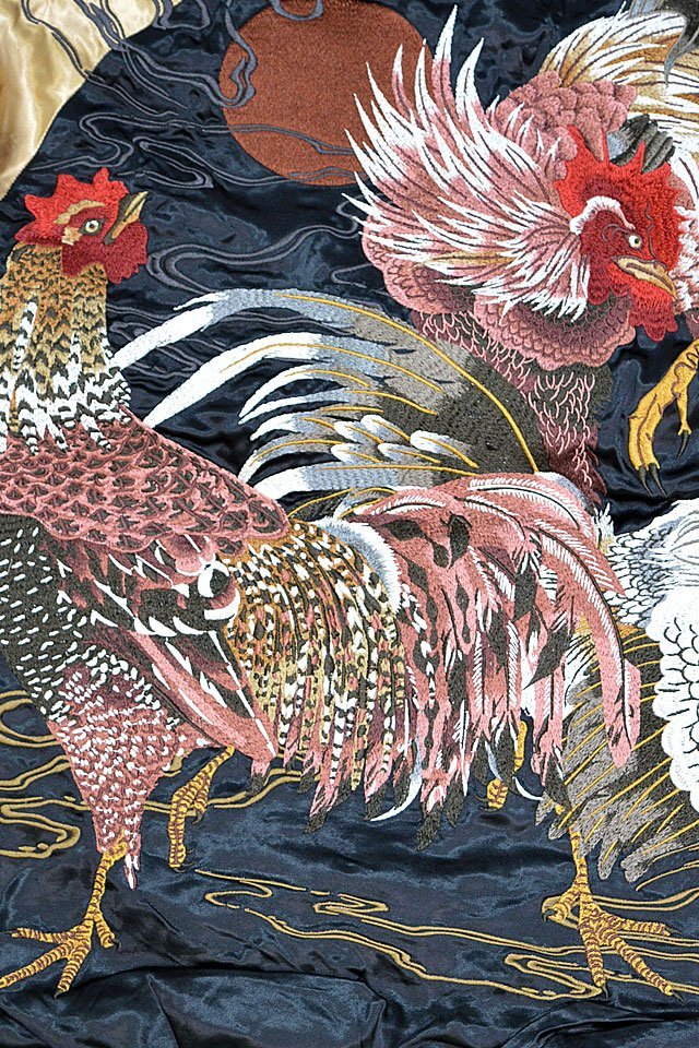 絡繰魂さんから、粋「群鶏図-若冲-」浮世絵リバーシブルスカジャン(233068)のご紹介です。 重みを感じる程の刺繍量が魅力的な絡繰魂から、最新作のスカジャンが登場しました。 今回モチーフの主役に採用されたのは、有名な伊藤若冲の群鶏図。 背中には、二羽の鶏をダイナミックに落とし込みました。 裾にはブランドロゴが印風に刺繍されています。 表面はしっかり柄の入ったスカジャンですが、対象的に裏面はシンプルに仕上げ、メリハリを付けました。 ボディーにはレーヨンサテンを使用し、ドレープや陰影がくっきりと現れています。 | ||||||||||||||||||||