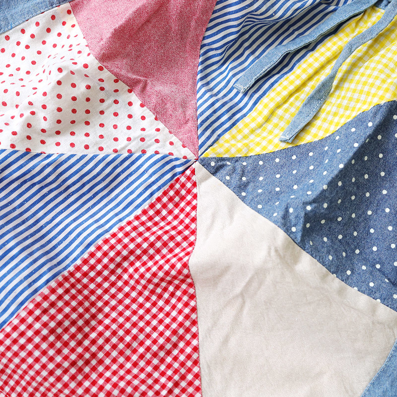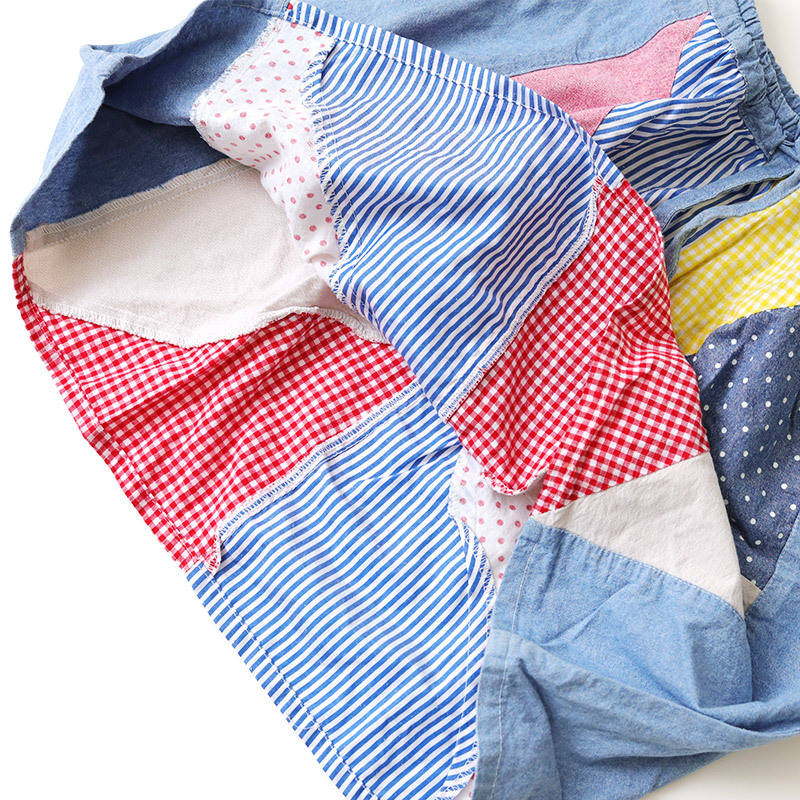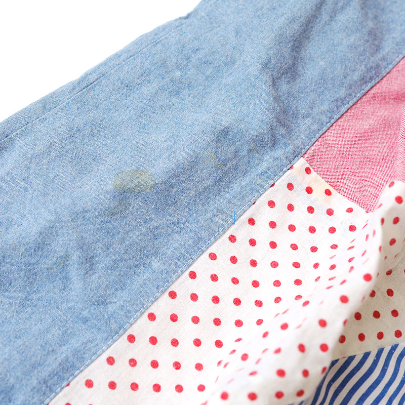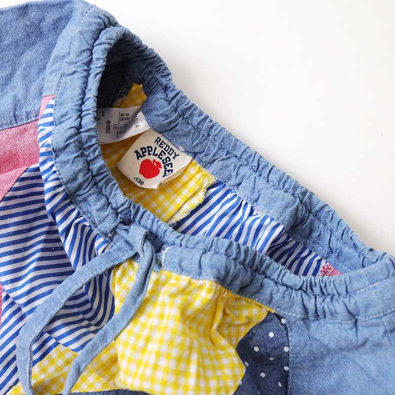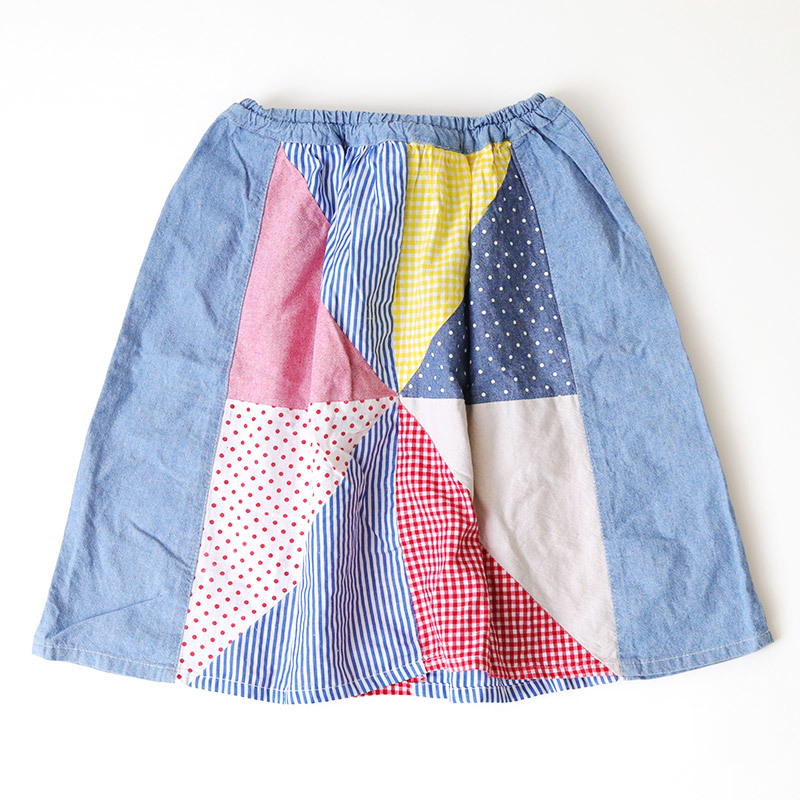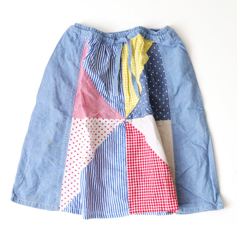 REDDY APPLESEED レディーアップルシード パッチワークデニムフレアスカート サイズ:130cm ウエスト:約52-60cm 総丈:約47cm 本体:コットン100% ストライプ:ポリエステル70% コットン30% 汚れ、全体的に着用感があります。