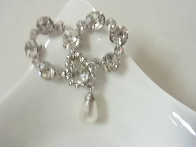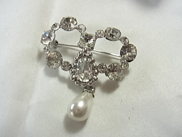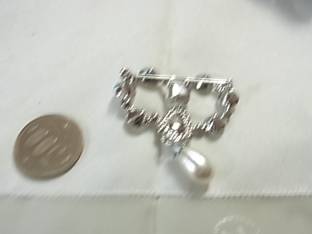 訳あり安価 雫型のプラスチックパールが揺れるデザイン 周囲は大粒のジュエルストーンが輝く 銀色 ブローチ◎