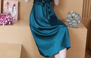 つるつるサテンリボンベルト付ワンピ-ス。胸元ドレ-プで裾までゆったり広がるシンプルデザインで、裏地はついておらずとても軽く着こなしやすいです。同布のリボンベルトをきゅっと結んでアクセントに。斜め左前 約30cmのスリットが入っていて、セクシーかつ高級感あふれる一着です。裏地なし。背中ファスナ-有。リボンベルト付き。