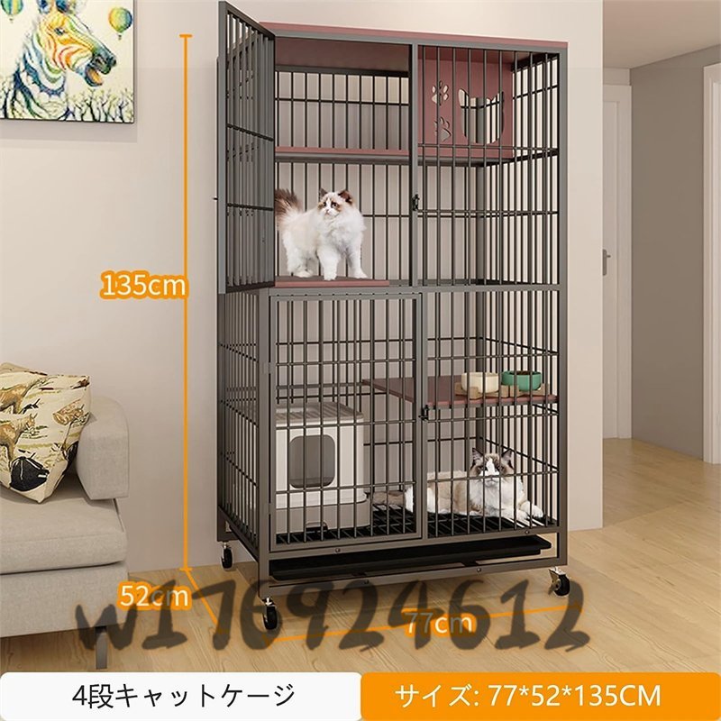 4段天然木猫 ケージ 猫 ケージ ステップ ペット用ケージ 猫 便器トレイ付きドアロック付きキャスター付 猫 ハウス 77*52*135cm