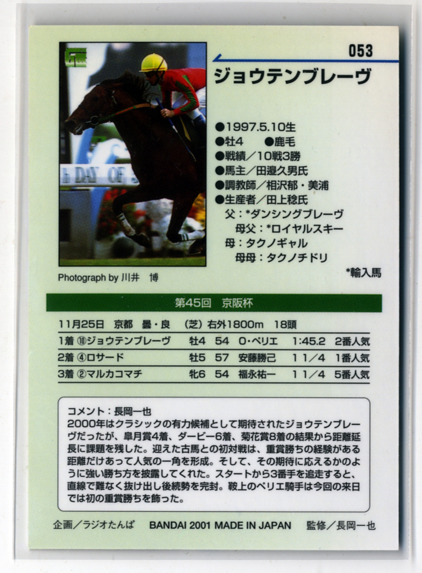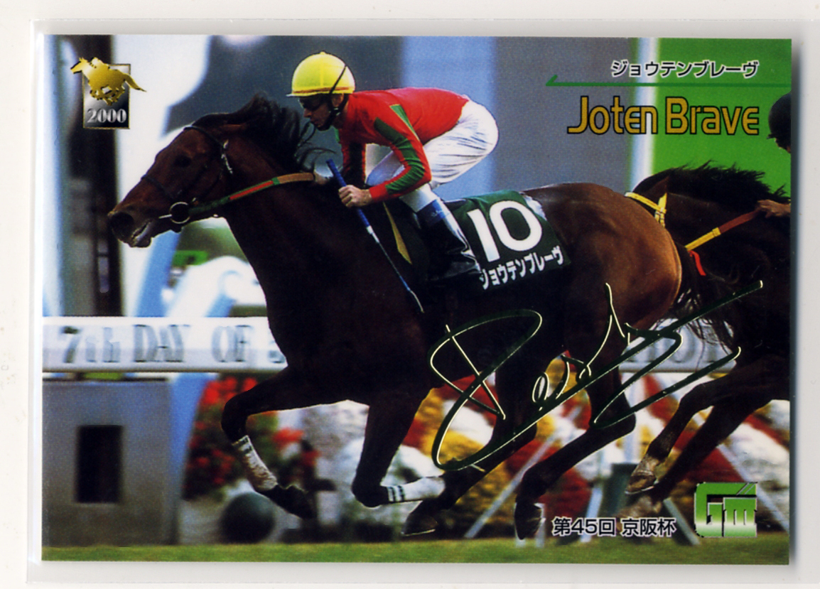 | ★サラブレッドカード2000年下半期版 パラレル 箔押し金文字サイン 053 ジョウテンブレーヴ 第45回京阪杯 O・ペリエ 写真 画像 競馬カード 即決 | |