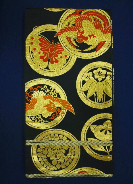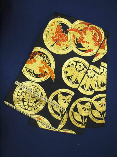 七五三 0253 七歳祝い袋帯 黒/金 家紋【中古】 (レターパック不可)