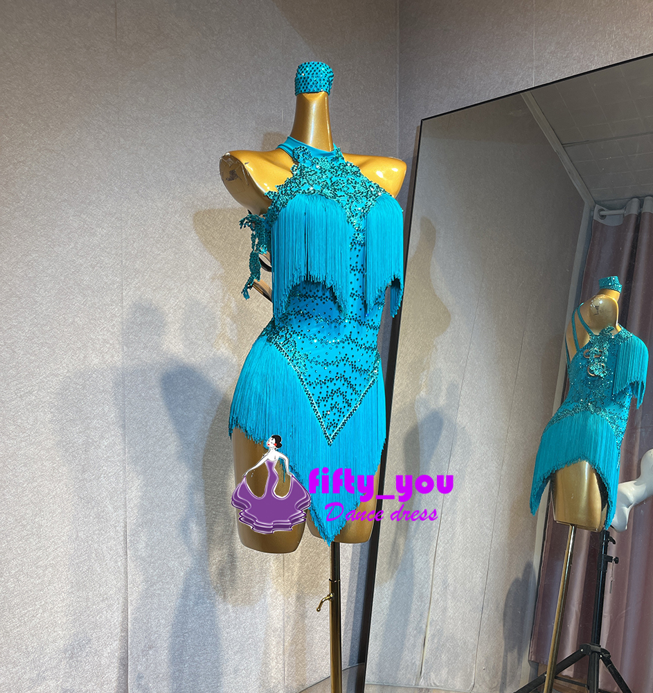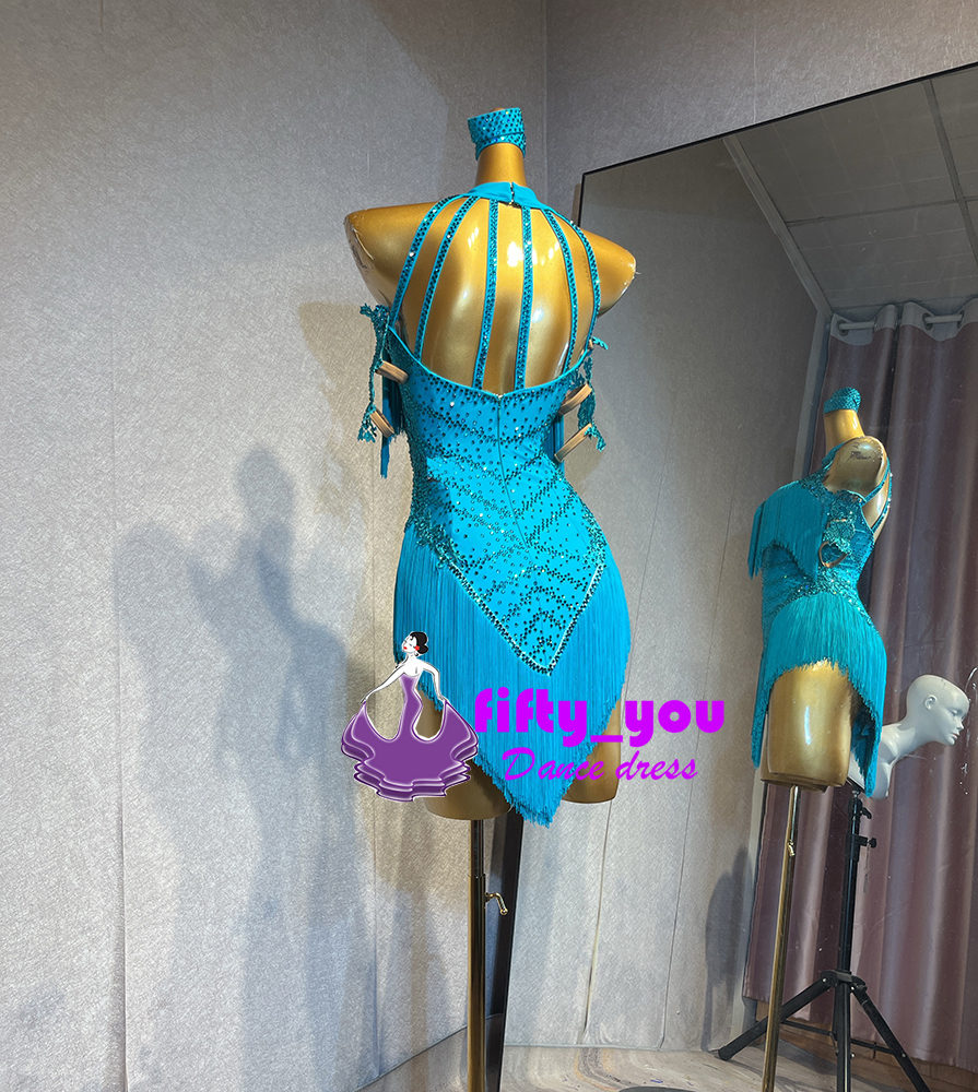 新品fifty_youレディース社交ダンス衣装 サイズセミオーダー ラテン競技試合用ドレス 高級品ドレス キラキラライトストーン飾 水色系
