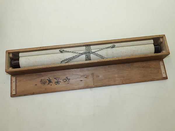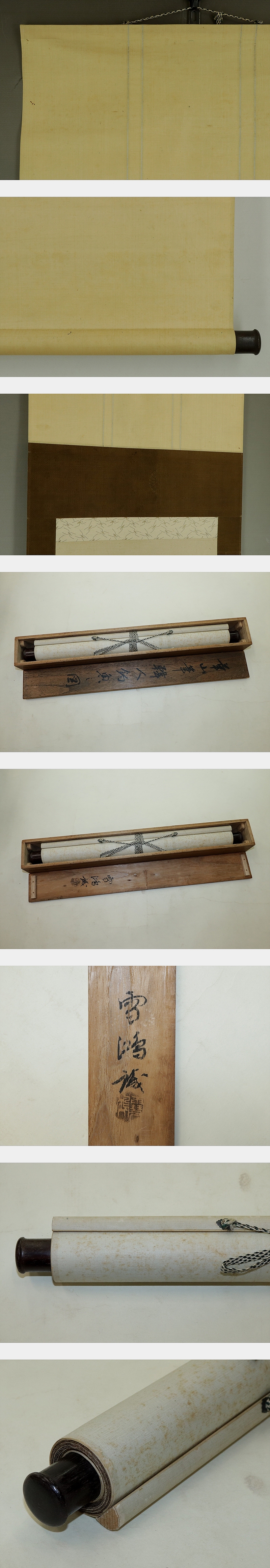渡辺華山 わたなべ-かざん(1793-1841) 江戸後期の画家・思想家・三河田原藩士。江戸生。名は定静、通称は登、字は伯登・子安、 のち崋山、号に昨非居士・寓画堂・全楽堂等。家老として藩務に精励する傍ら蘭学に親しみ、 高野長英・小関三英らと尚歯会を結成。画は白川芝山・谷文晁に学び、 種々の画法を研究しながら風俗写生に才をみせ、洋画描法をも摂取して 特に肖像画に洞察の深さと筆鋒の鋭さを発揮した。 蛮社の獄に連坐した蟄居中、天保12年(1841)歿、49才。 本紙は、染み、汚れ、折れ、皺、擦れがあります。 表装は、染み、汚れ、折れ、皺、虫食、ほつれ、くすみがあります。 【サイズ】 作品 横約33cm×縦約104cm 表装 横約44cm×縦約199cm |