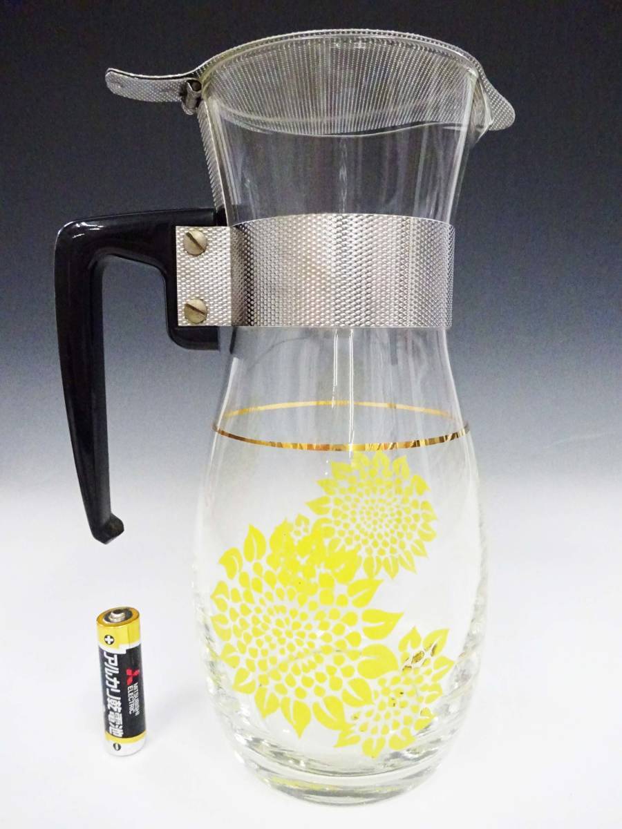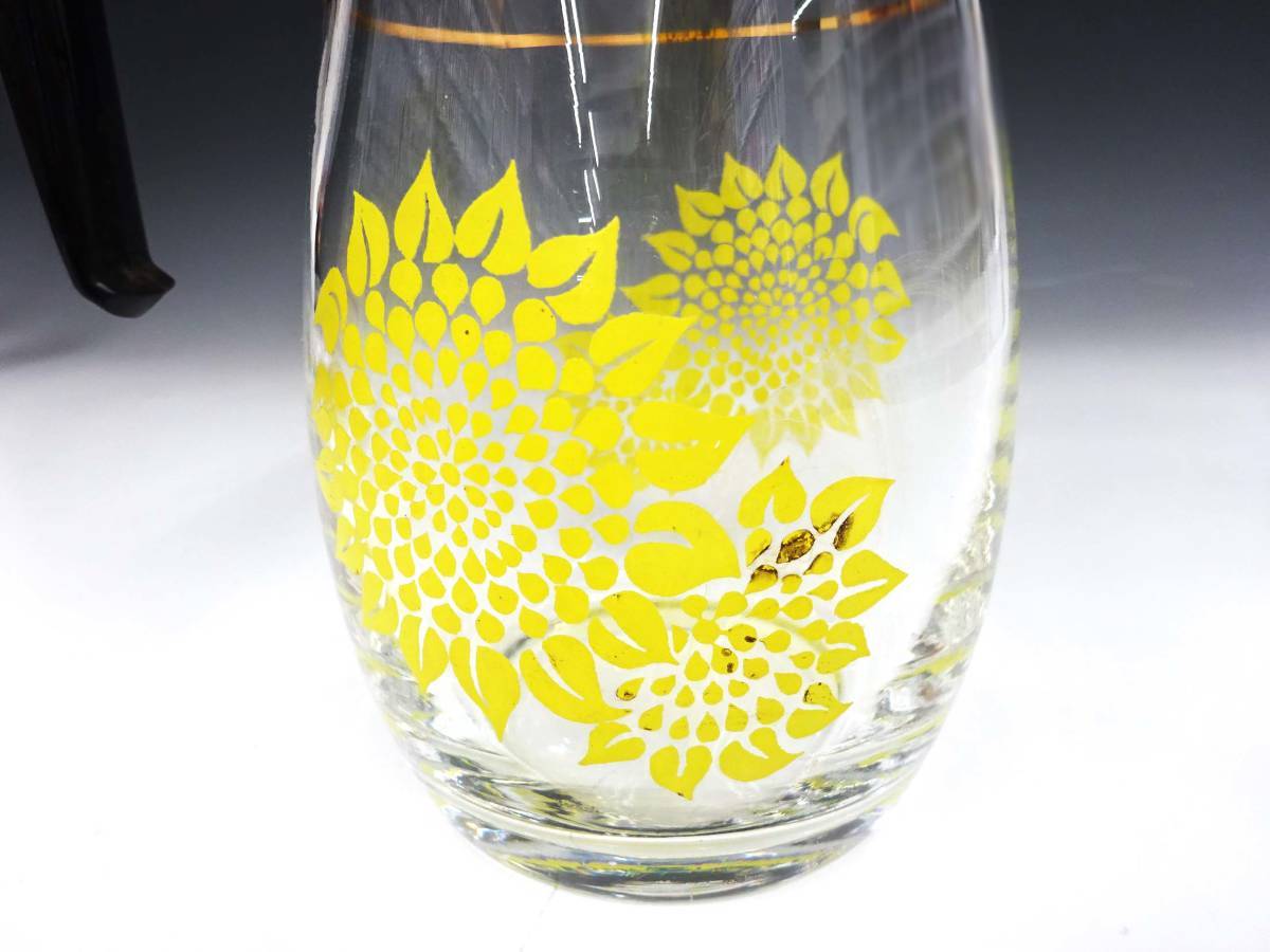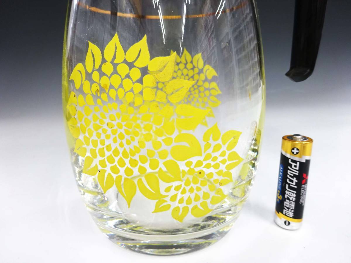 ◆(NA) 昭和レトロポップ ガラス ピッチャー 黄色花柄 デカンタ デキャンタ 取っ手付き キッチン雑貨 お水入れ 純喫茶 喫茶店 雑貨 食器