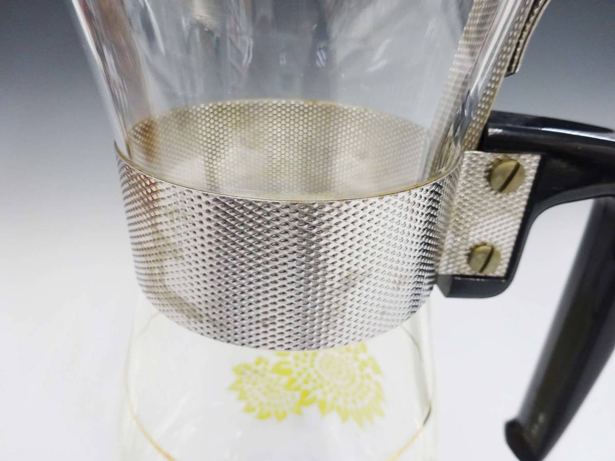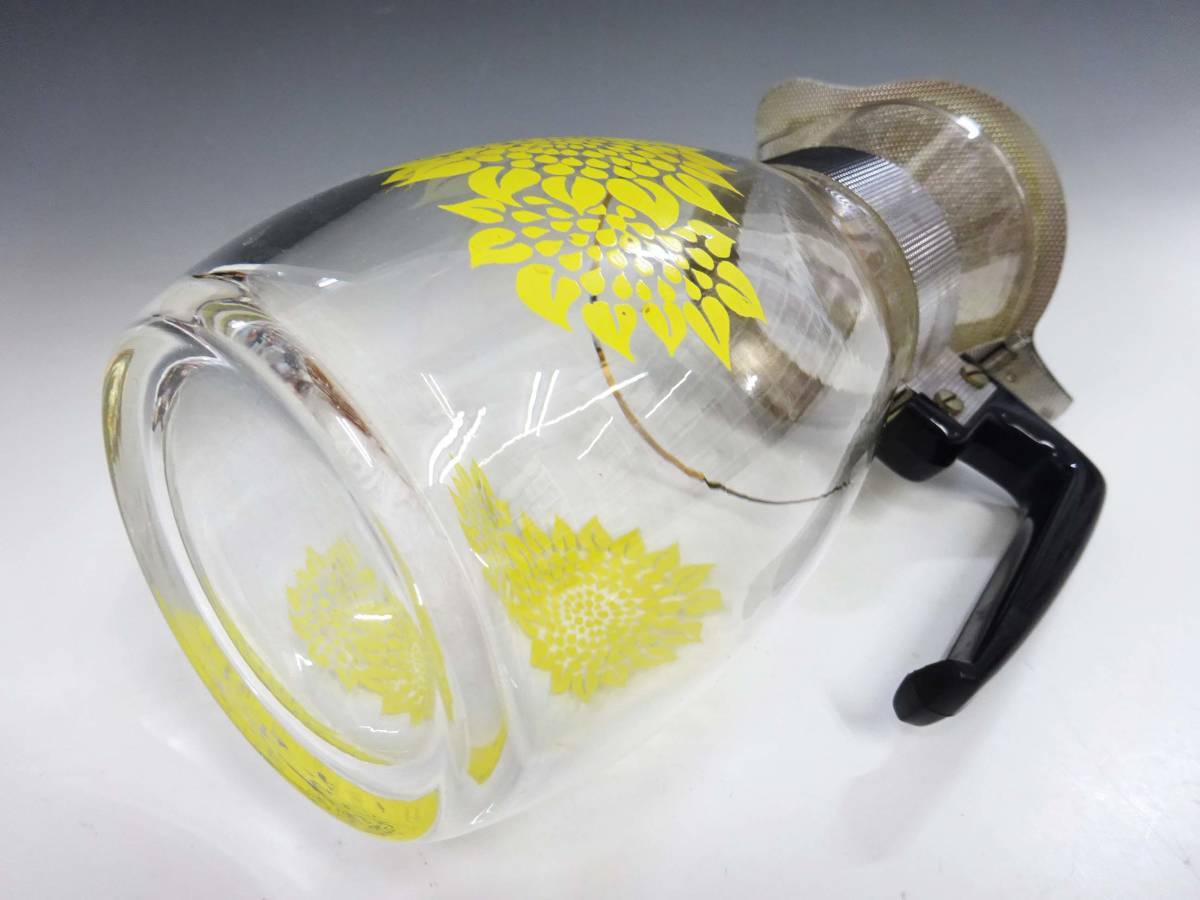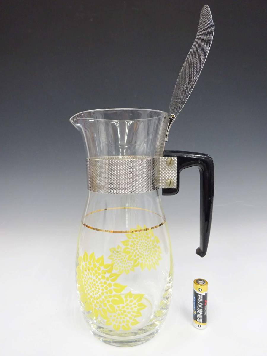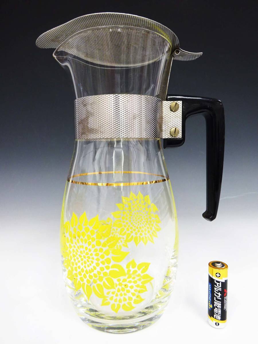◆(NA) 昭和レトロポップ ガラス ピッチャー 黄色花柄 デカンタ デキャンタ 取っ手付き キッチン雑貨 お水入れ 純喫茶 喫茶店 雑貨 食器
