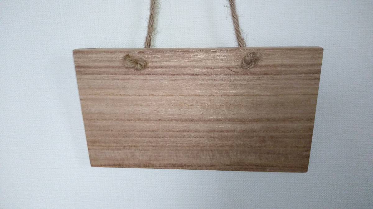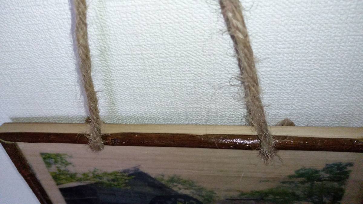 プレート上部には穴が二カ所空いていて、ここに麻のようなヒモが付いていますので、壁に掛けることができます。