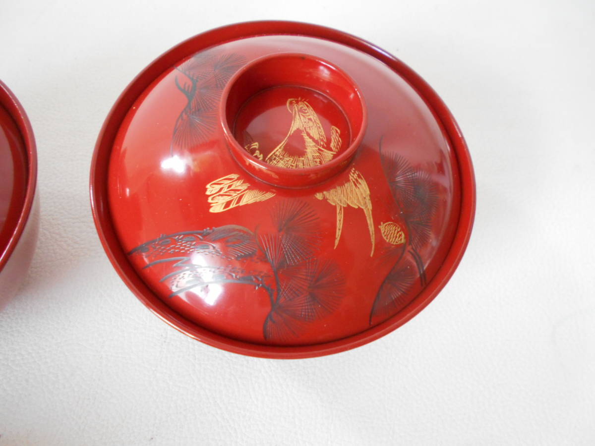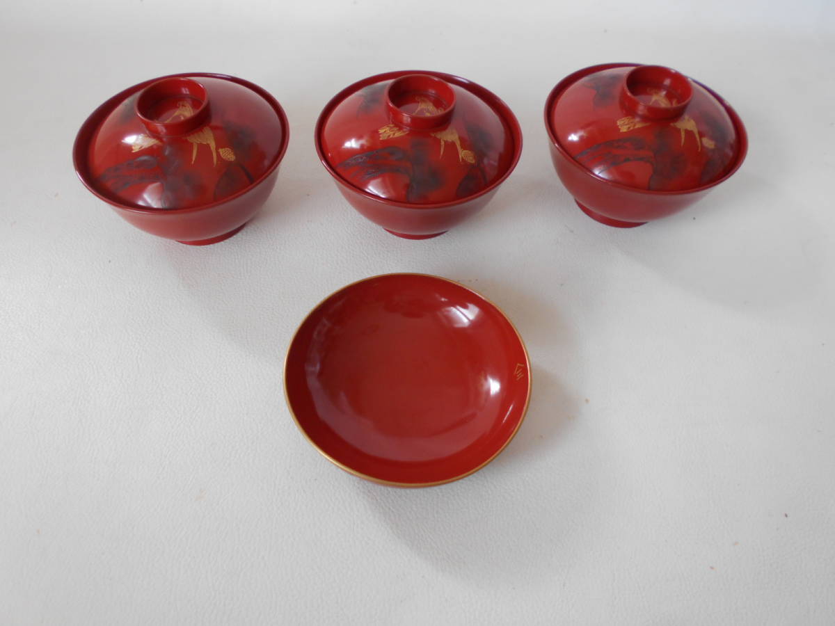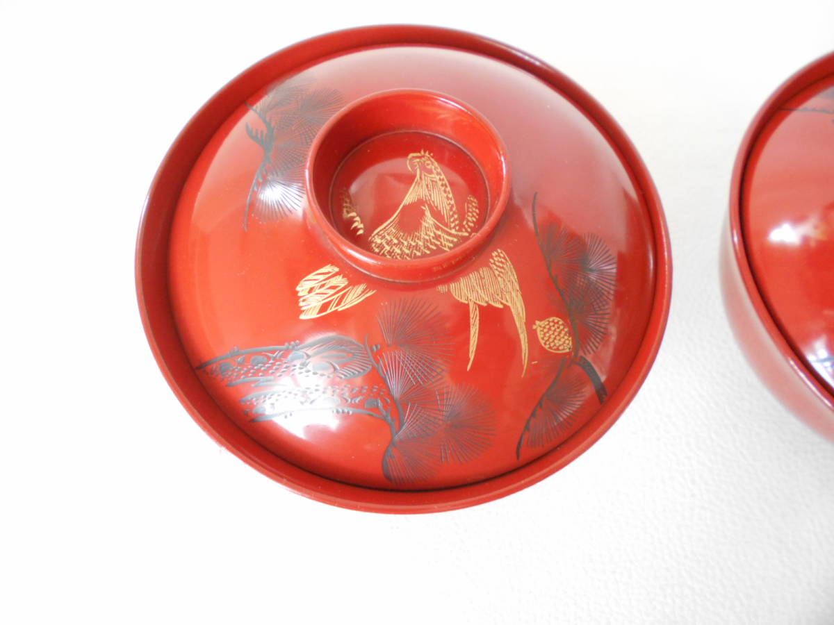 山三 漆器塗り 木製漆器 鷹 松 蓋付き 汁椀 3客 小鉢 1客 計4客 縁起物 未使用自宅保管品