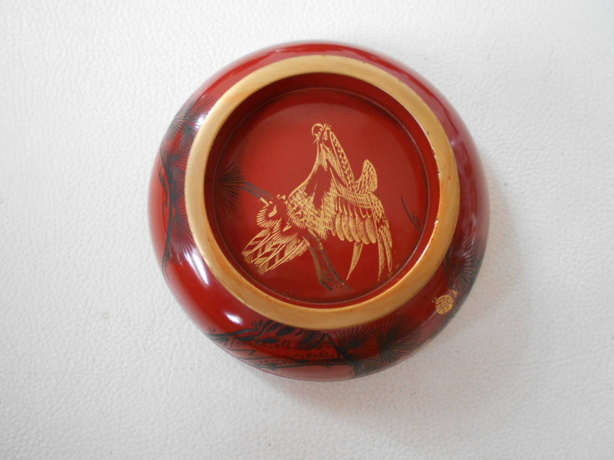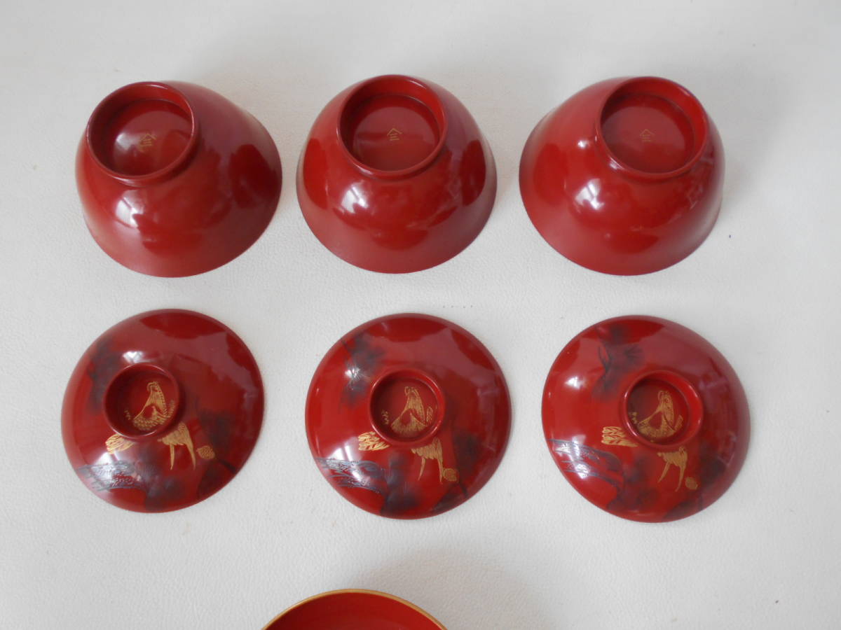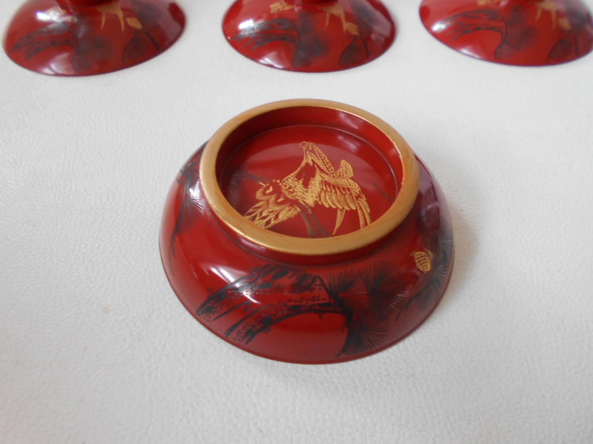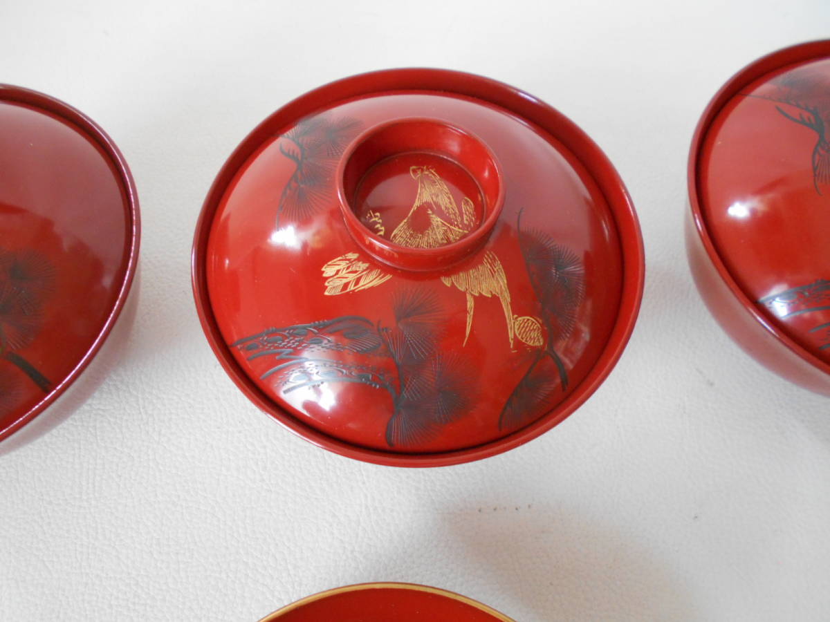 山三 漆器塗り 木製漆器 鷹 松 蓋付き 汁椀 3客 小鉢 1客 計4客 縁起物 未使用自宅保管品