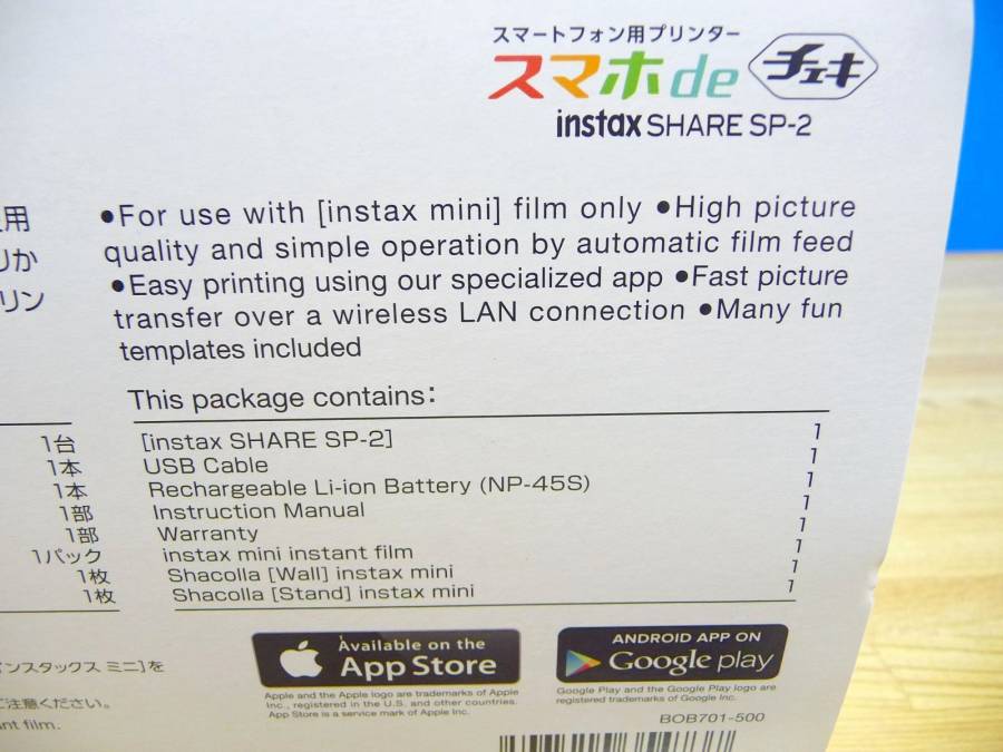 | 商品説明 | 製品:FUJIFILM フジフィルム 「スマホdeチェキ」instax SHARE SP-2 「Shacolla Kit(シャコラキット)」【限定モデル】 (INSSHARESP2SHACOLLAKIT シャコラキット) です。 大手家電量販店購入の新品です。即決です。消費税はかかりません。 在庫残り僅かです。 ◆製品 【数量限定】〔iOS/Androidアプリ〕 「スマホdeチェキ」 instax SHARE SP-2 「Shacolla Kit(シャコラキット)」 [生産完了品 在庫限り] <商品の特徴> 〔スマートフォン対応:モバイルプリンター〕 大人気チェキプリンター(スマートフォン用プリンター) 「スマホdeチェキ」instax SHARE SP-2(ゴールド)に、 「チェキフィルム 1パック(10枚入り)」 大人気フォト雑貨「シャコラ(壁タイプ/スタンドタイプ 各1枚)」が付いた 数量限定コラボキット! <「スマホdeチェキ」 instax SHARE SP-2(ゴールド)> ■スマートフォンで撮影した画像をその場で簡単にプリント可能。 (画像は専用アプリを使ってWi-Fiで送信) ■男女を問わず様々な生活シーンで使用できる、シンプルかつモダンなデザインを採用。 ■有機ELを用いた露光方式を採用し、320dpiの高解像度(SVGA:800×600ピクセル)を実現。 ■従来機では別々に行っていたチェキフィルムの露光と排出を同時に行うことにより、 約10秒の高速プリントを実現。 ■充電式バッテリーを採用(micro USB端子)。1回の充電で約100枚のプリントが可能。 ■アプリにフィルターや豊富なテンプレートを搭載。 ・カスタムフィルター(新搭載) 画像の明るさ、コントラスト、彩度を、スライダーバーを左右に動かすことで 自由に調整できるフィルター。 ・分割テンプレート(新搭載) 2~4枚の画像を組み合わせて1枚のチェキプリントにできるテンプレート。 特別な1日の思い出を1枚にまとめてプリントしたり、 テーマに沿った写真を集めてプリントできます。 ・組み写真テンプレート(新搭載) 1枚の画像を2枚のチェキフィルムに分割して出力できるテンプレート。 綺麗な風景写真をチェキフィルム2枚分の大きなプリントに見立てる等、 ユニークな飾り方が楽しめます。 ・SNSテンプレート Instagram、FacebookなどのSNSにアップした画像をプリントできるテンプレート。 プロフィール画像や「いいね!」の数も合わせて出力できるため、 SNSと連動したプリントが楽しめます。 ・リアルタイムテンプレート 画像を撮影した時間や場所、天気、温度、湿度を印字できるテンプレート。 旅行先での思い出の撮影や、赤ちゃんの成長記録などにおすすめです。 ●「スマホdeチェキ」専用アプリ 無料のオリジナルアプリをダウンロードするだけ。スマホ画像をかんたんにプリントできます。 【動作環境】 ・Android OSの端末の動作環境:Android4.0以降、かつGoogle Playがインストールされている。 ・iOSの端末の動作環境:iOS 7.1以降。iPhone、iPad、および iPod touchに対応。 ※端末の機種によっては、アプリケーションをインストールし、 上記の動作環境を満たしている場合でも、 使用できない場合があります。 ※Android 6.0以降をお使いのお客さまにつきまして、 「GPS機能がOFFの状態だとプリンターとの接続ができない」という現象が発生しております。 お手数ですが、本現象に該当するお客さまはGPS機能を ONにしてお使いいただくようお願い致します。 <シャコラ(shacolla) 壁タイプ 1枚パック チェキサイズ> ■写真を貼って、飾れるフォトパネルです。 ■壁やガラスなどの平らな場所に貼れる壁タイプ。 ■貼り直しができて、繰り返し楽しめます。 ■パネル両面に、特殊な低粘着のりが塗布されています。 ■チェキサイズ用(54×86mm) 厚さ:5mm <シャコラ(shacolla) スタンドタイプ 1枚入り チェキサイズ> ■写真を貼って、飾れるフォトスタンド! ■組み立て簡単なスタンドつき! ■貼り直しができて、繰り返し楽しめます。 ■パネル片面に、特殊な低粘着のりが塗布されています。 ■使い方はかんたん! 1.片面のシートをはがして、写真を貼ります。 2.裏面のスタンドを組み立てて、飾れば完成! <同梱物> USBケーブル、充電式リチウムバッテリー(NP-45S)、チェキ用フィルム 1パック(10枚入り)、 シャコラ(Shacolla)壁タイプ チェキサイズ 1枚、シャコラ(Shacolla) スタンドタイプ チェキサイズ 1枚、使用説明書、保証書 ■高精彩・高画質に。豊かな表現力 新搭載の露光システムにより、表現力が大幅に向上。チェキ独特の風合いは残しつつも、 320dpiの高解像度により風景写真の微細なグラデーションやテキスト、 どうしても顔が小さくなってしまう全身ポートレートでもクッキリと再現可能です ■わずか10秒。驚きのプリントスピード 画像データ送信から排出まで待機時間はわずか10秒と、 チェキならではの「撮ってすぐ出てくる」スピーディーなプリント体験を提供します。 ・フィルムやバッテリーの残量を示す高輝度LED搭載。 ↓ ・リプリント機能で同じ写真を複製できます。 ↓ ・充電式バッテリー搭載(マイクロUSB端子)。 ■フィルター機能で加工も簡単 画像を最適に処理する「FUJIFILM Intelligence Filter」をはじめ、 「モノクロ」「セピ