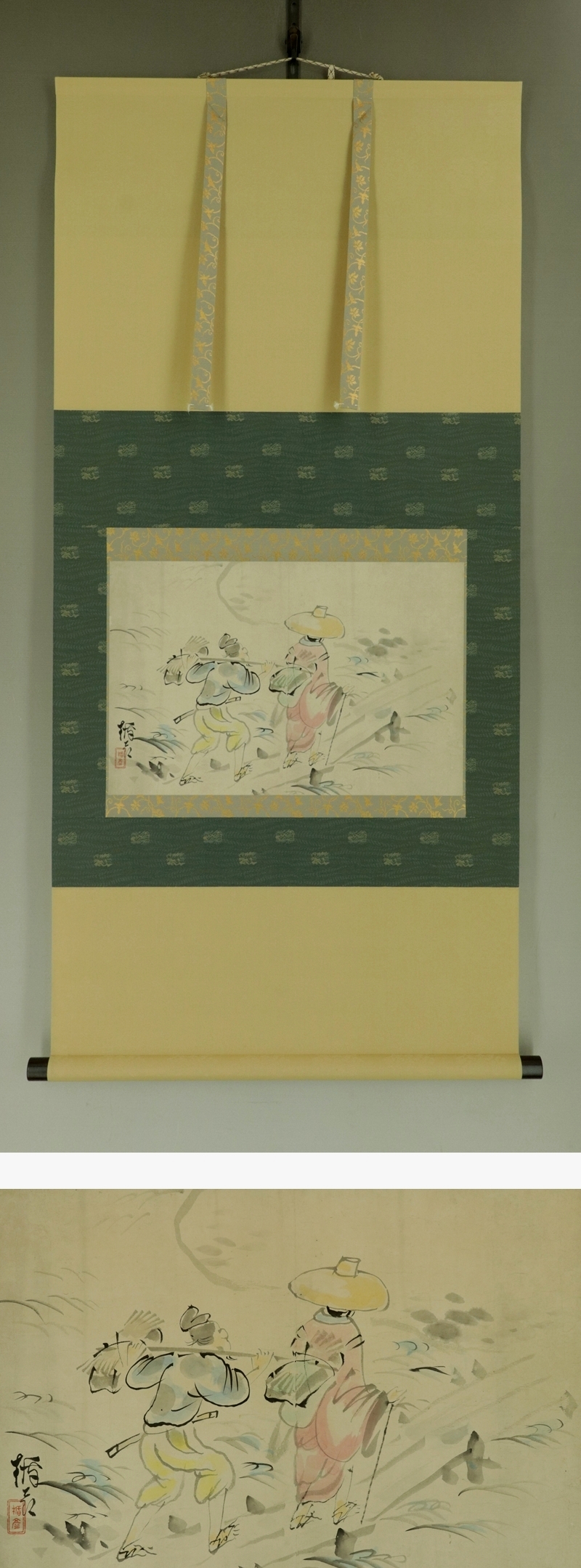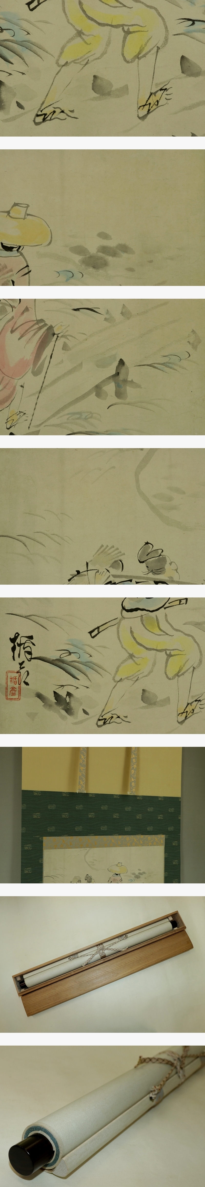 菅楯彦 すが-たてひこ(1878-1963) 明治-昭和時代の日本画家。 明治11年3月4日生まれ。独学で画を学び,また有職故実を研究。 歴史画や大阪の市井風俗を描いた。 昭和33年芸術院恩賜賞。37年大阪市名誉市民。昭和38年9月4日死去。85歳。 鳥取県出身。本名は藤太郎。 本紙は、染み、汚れ、破れ痕があります。 表装は、概ね良好です。 【サイズ】 作品 横約45cm×縦約30cm 表装 横約59cm×縦約126cm |