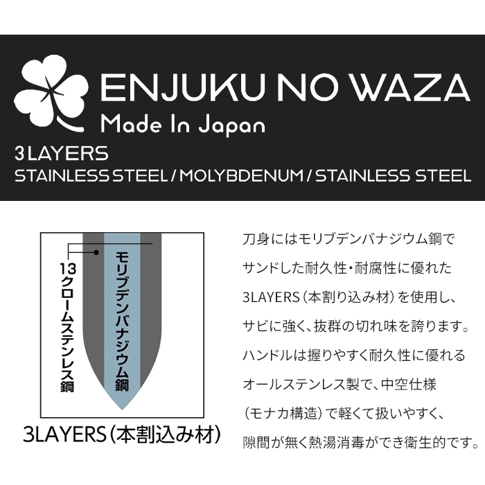 | [刀身]ステンレス刃物鋼(心材:モリブデンバナジウム鋼) [ハンドル]18-8ステンレス |