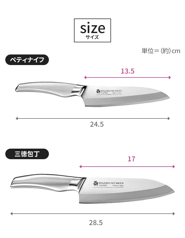 | [ペティナイフ]約全長24.5cm(刃渡り13.5cm) [三徳包丁]約全長28.5cm(刃渡り17cm) |