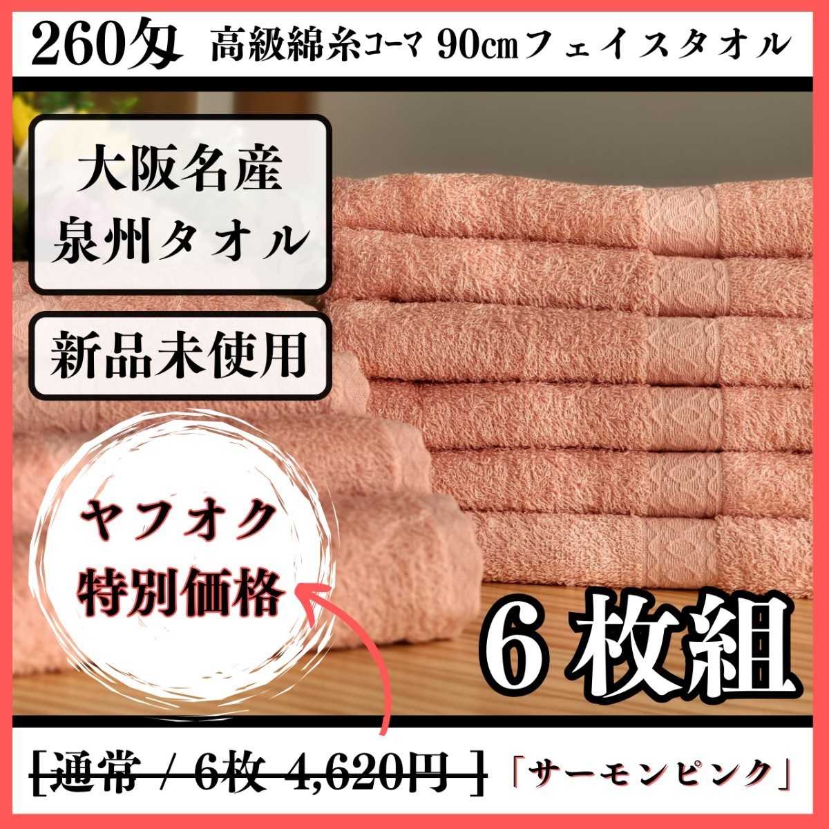 【泉州タオル】260匁高級綿糸コーマ90cmフェイスタオルセット6枚【サーモンピンク】タオル新品 優しい肌触り まとめ売り 吸水性抜群