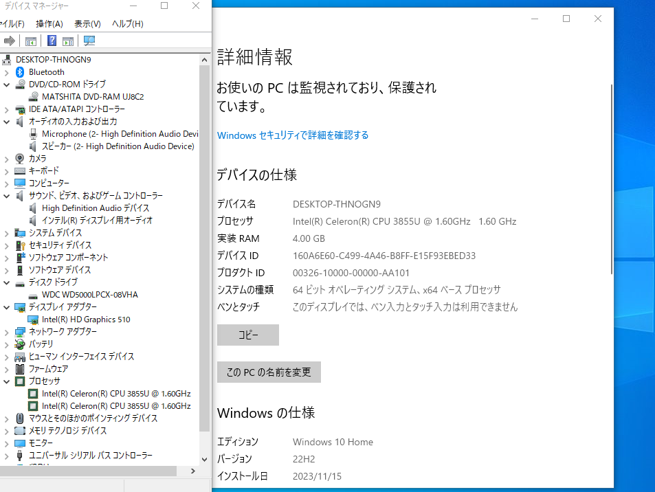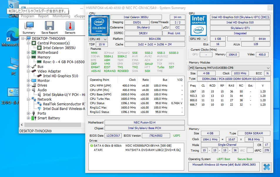 | CPU | Intel Celeron プロセッサー 3855U 2M キャッシュ、1.60 GHz |