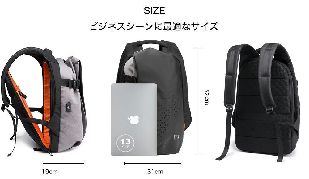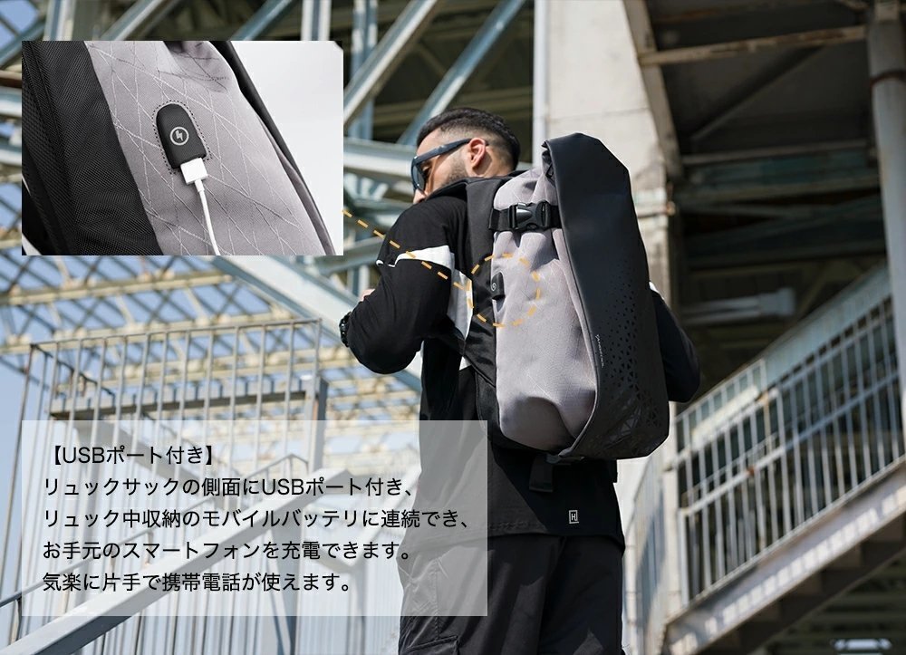 【USBポート付き】リュックサックの側面にUSBポート付き、リュック中収納のモバイルバッテリに連続でき、お手元のスマートフォンを充電できます。気楽に片手で携帯電話が使えます。