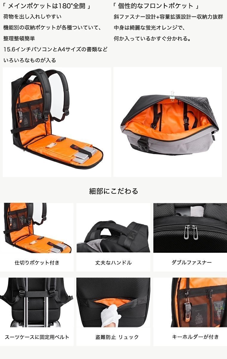 【ビジネスリュック メンズ】ファッション設計で、実用性も高いリュックサックです。バックパックの中身は綺麗な蛍光オレンジで、何か入っているかすぐ分かる。背面ポケットは180°広がり、荷物が一目瞭然で把握できる。ビジネスはもちろん、通勤も通学も、自転車やバイクのサイクリング・ツーリング・山登りなどのアウトドア活動にもおすすめ。