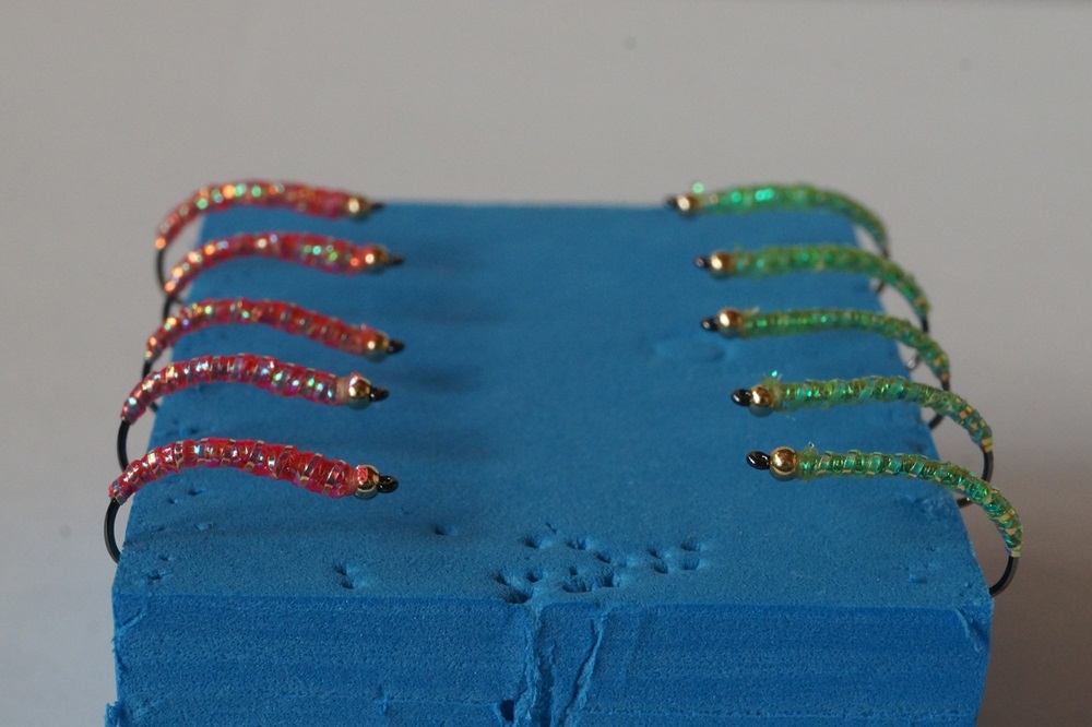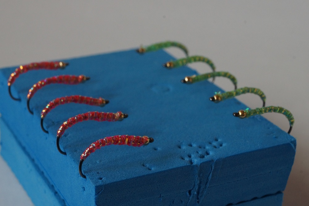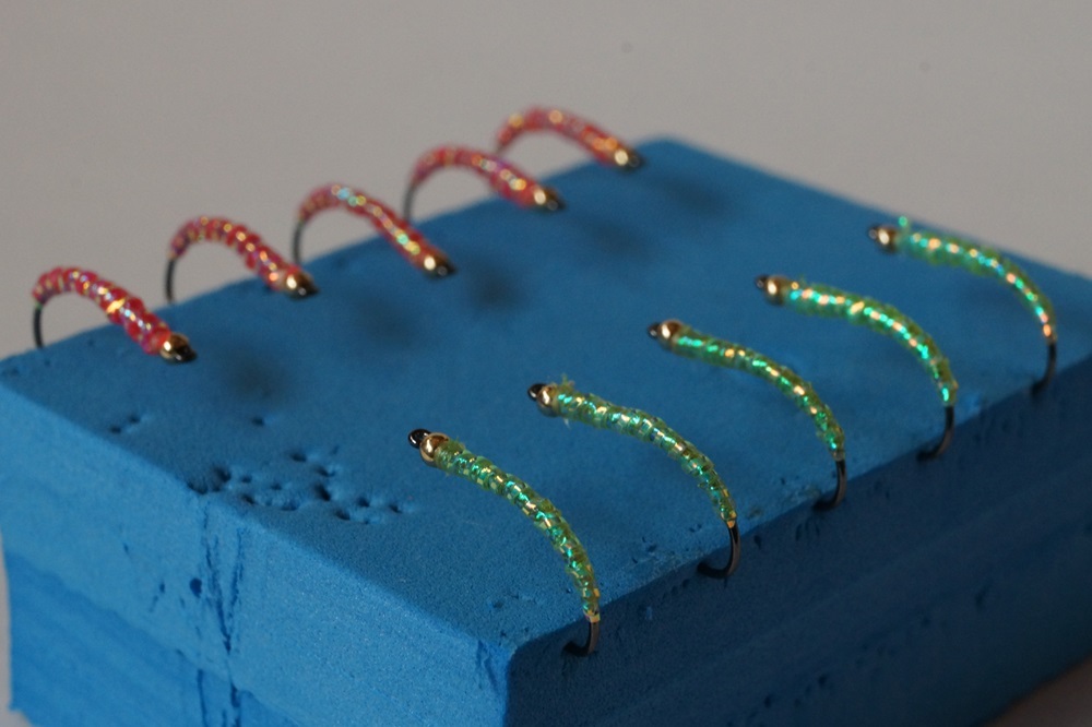 ケイムラ化工のオーロラスレッズ(赤・黄緑)と蓄光スレッズを使ったラーバパターンです。 #10バーブレスを使用しています。 発送は定形外郵便を予定して居りますが、破損・紛失で補償されませんのでご了承下さい。