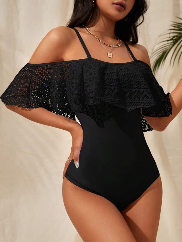 レディース 水着 ワンピース コントラストレース フリルトリム コールドショルダー ワンピース水着