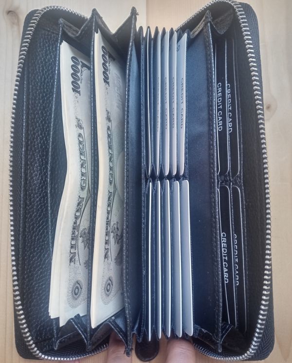 丈夫な縫製で長くご愛用いただける長財布です。 ※ラウンドファスナー型の内部はカード収納箇所が普段使用するカードと使用頻度が低いカードを収納する箇所を分けて装備しております。 また、札入れ箇所やポケットを多数装備した多機能長財布です。 ※小銭入れはボタン式のポケットを小銭入れとして使用する事も可能。ラウンドファスナーで閉じると小銭は落ちてきません。 ※他にも多数のデザインの商品を出品しておりますのでご覧ください。 商品仕様 ■サイズ/寸法 約200×100×35mm ■素材/材質 :高級牛革使用 内部の一部を布を使用しております。 ■カード入れ:最大17枚まで対応 ■札入れ2ケ所 ■小銭入れ:有り(ボタン式ポケットを使用。ラウンドファスナーで閉じると小銭は落ちてきません。) ■ポケット:3ケ所(間仕切り) ■財布本体の外側にポケット収納が1ケ所あります。 ※当商品は黒色です。色違いの詳細部分の写真を掲載しておりますがイメージとしてお願い致します。 |