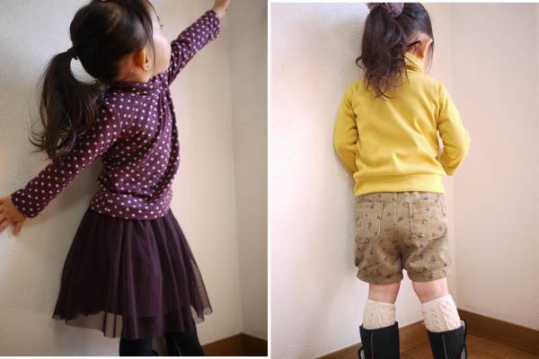 画像のパープルドット、マスタード色は身長84㎝で90サイズを着用、