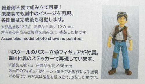 1986年に劇場公開された「天空の城ラピュタ」に登場する ラピュタを護る自律式戦闘ロボット の組立キットです 内部フレームを組み、それを覆う様に外装部を組み立てる方式の 接着剤不要のスナップフィットモデル。 パーツは成形色をアニメ設定に近い物とし、無塗装でその雰囲気をイメージできます。 同スケールのパズーをフィギュアとして付属(こちらは7パーツ構成、単色未塗装) ロボット兵の胸の紋章とパズーの目を付属ステッカーで再現 (C) Studio Ghibli |