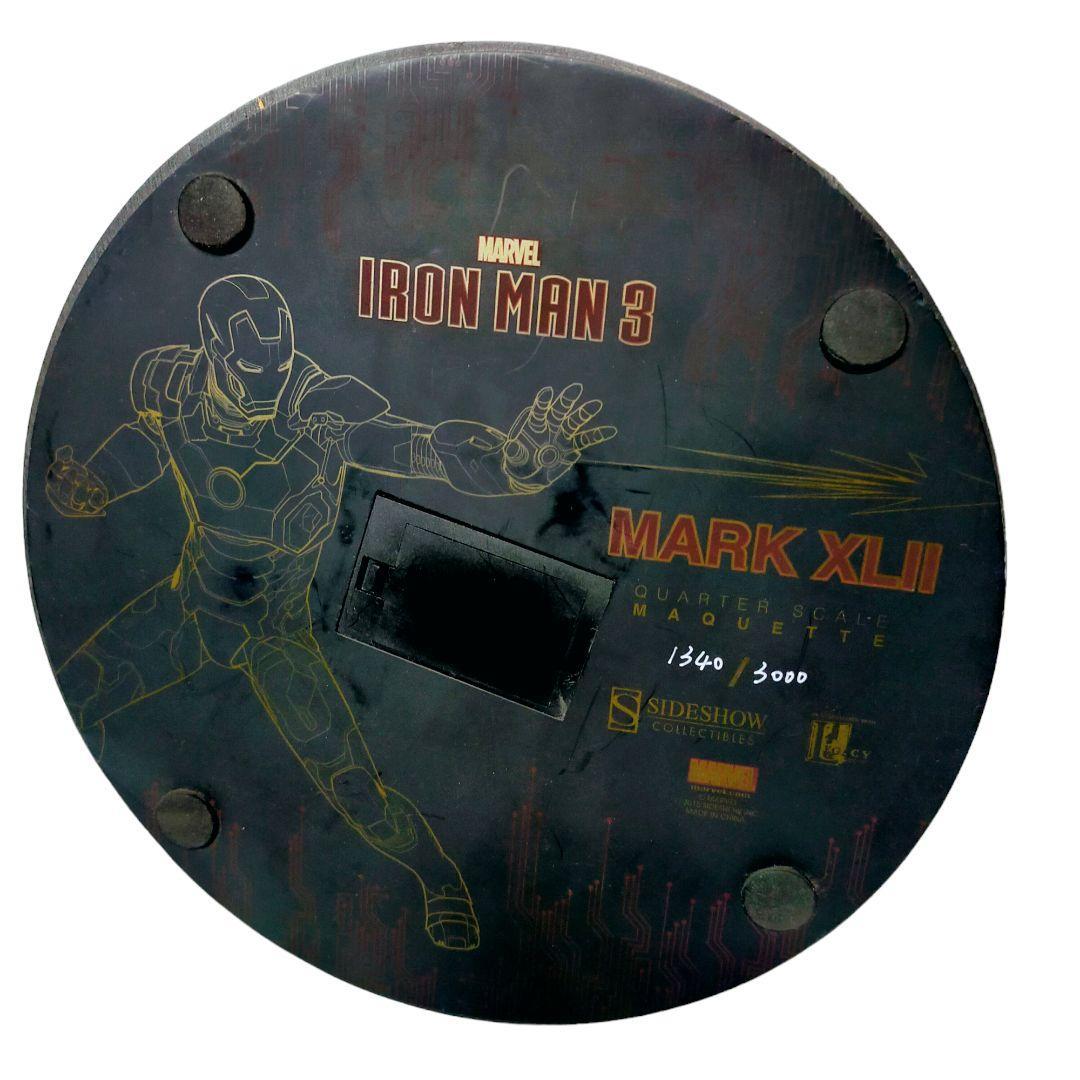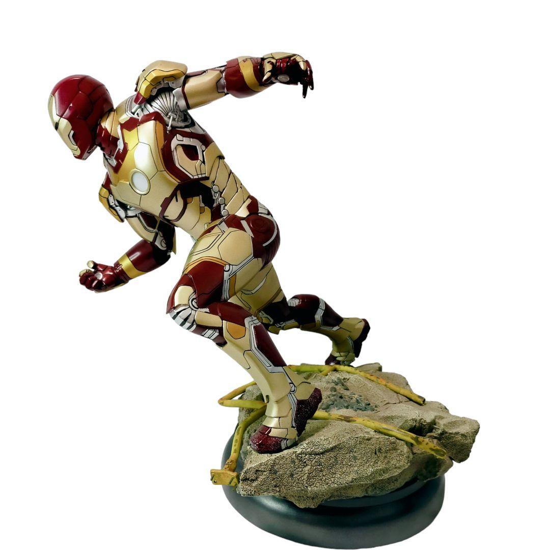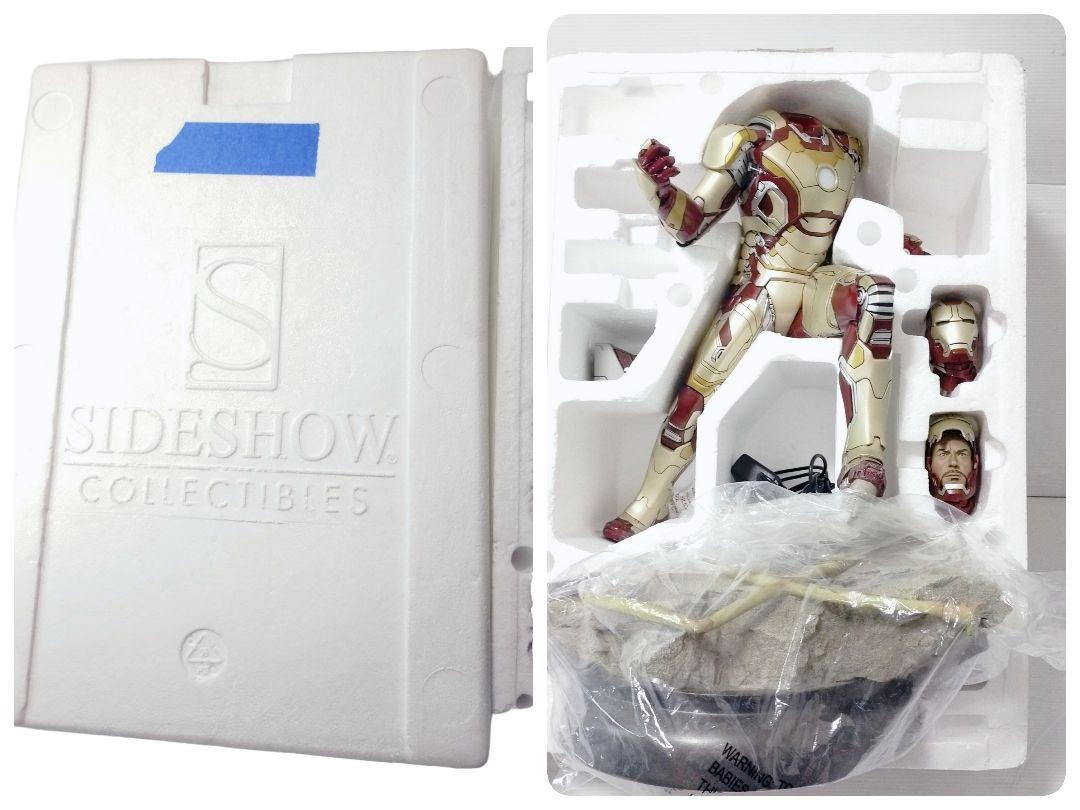 サイドショウより、「アイアンマン3」に登場する「アイアンマン マーク42」が1/4スケールのマケットでラインナップ! 映画「アイアンマン」シリーズのSFXを指揮しているレガシー・エフェクツ・スタジオとコラボし、主人公のスタークが最新かつ最強のマーク42を身につけた姿を、映画に極めて忠実に最高級の仕様で再現! 高さ約51センチで、破壊された瓦礫の台座の上に立ち、まさにこれから敵を迎え撃とうとするかのような躍動感溢れる造形となっています。 ヘッドは、通常のアイアンマンのヘッドと、前部ハッチが開いてトニー・スタークを演じるロバート・ダウニー・Jrの生き写しのようなご尊顔が拝めるヘッドの、2種が付属したスペシャル仕様となっています。 ハンドペイントによる光沢塗装仕上げによってメタル感のリアルさが完全再現されたマーク42は、目の部分や手のリパルサーレイ、そして胸のアーク・リアクターのライトアップギミックを搭載した、世界中のコレクターにとって必須のアイアンマンのグッズといえます。 これぞ究極のマケットです!!