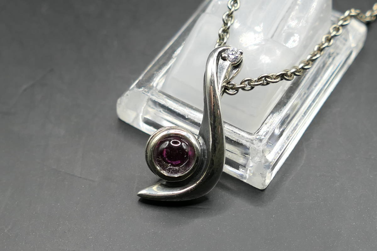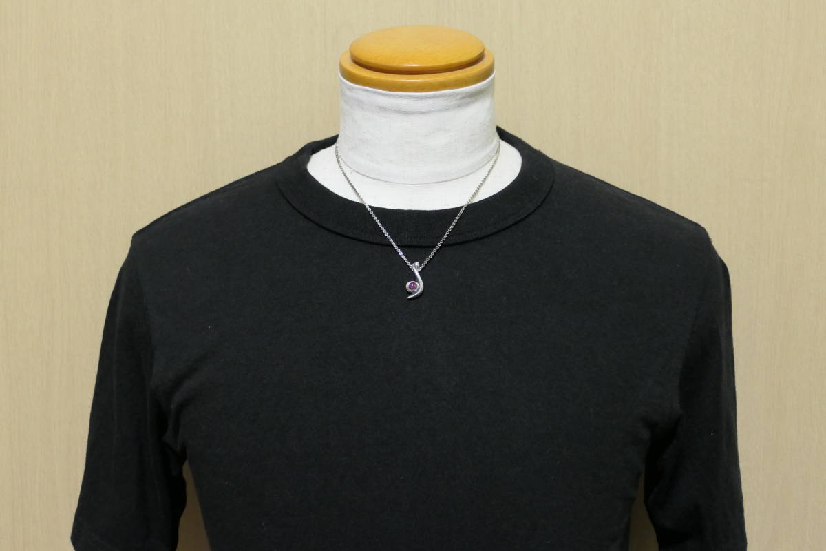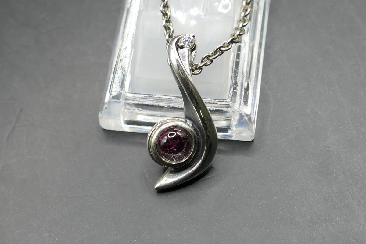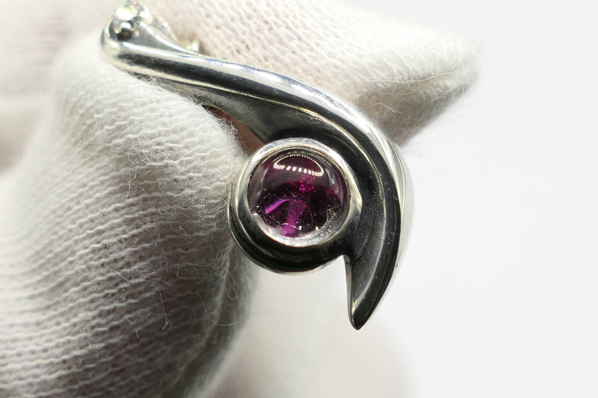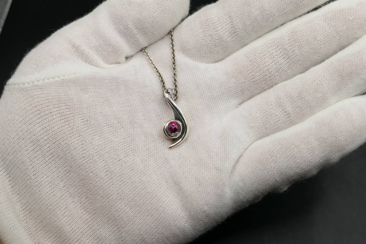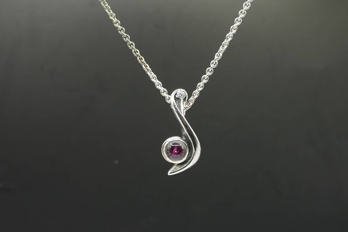 音符のようなモチーフで、中央に赤いジルコニア、上部に小さなジルコニアが埋め込まれています。