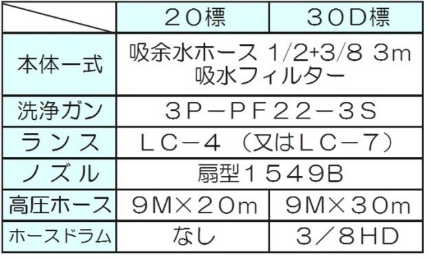 ■標準セット内容 (1)扇型ノズル付LC-4(40cm)ランス (2)スイベルジョイント付洗浄ガン (3)丸型ドラム巻30mホース (4)ツイン吸余水ホース3m (5)各接続部は高圧ジョイント仕様の充実内容となっております!