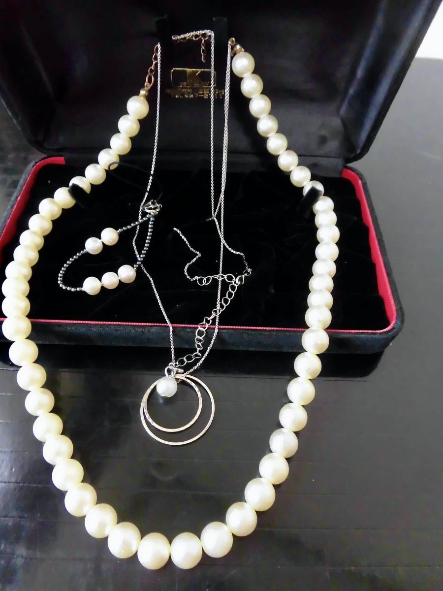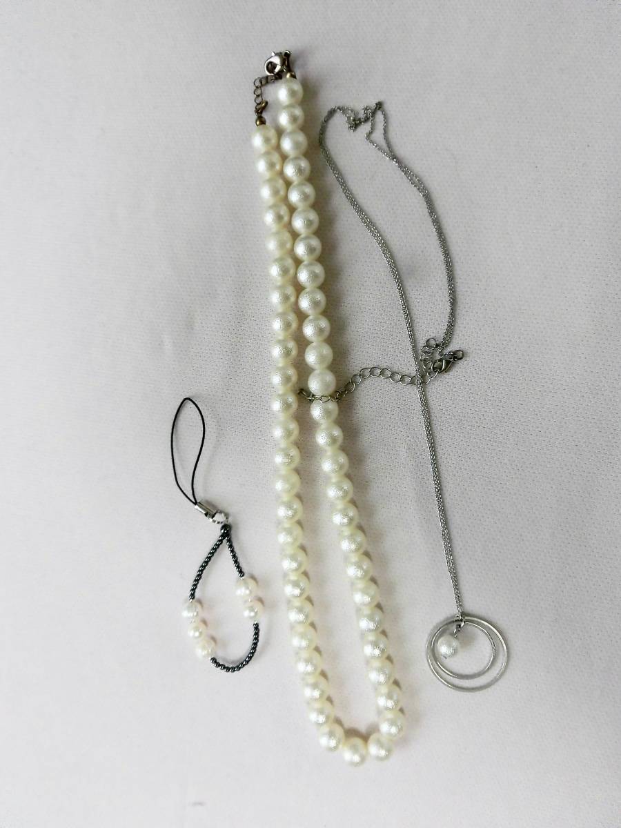 ●未使用 美品大玉パールネックレス+パールペンダントネックレス+パールストラップ/3点セット 1.大玉パールネックレス 10mm 長さ約53cm+アジャスター5cm 2.パールペンダントネックレス シルバー2連サークル、長さ約53cm+アジャスター5cm 3.パールデザインのストラップ 全長12cm パール玉5個付デザイン お得な3点セットです、装いのアクセントにいかがでしょう! ●状態/未使用 美品 目立った損傷はありません。 | |