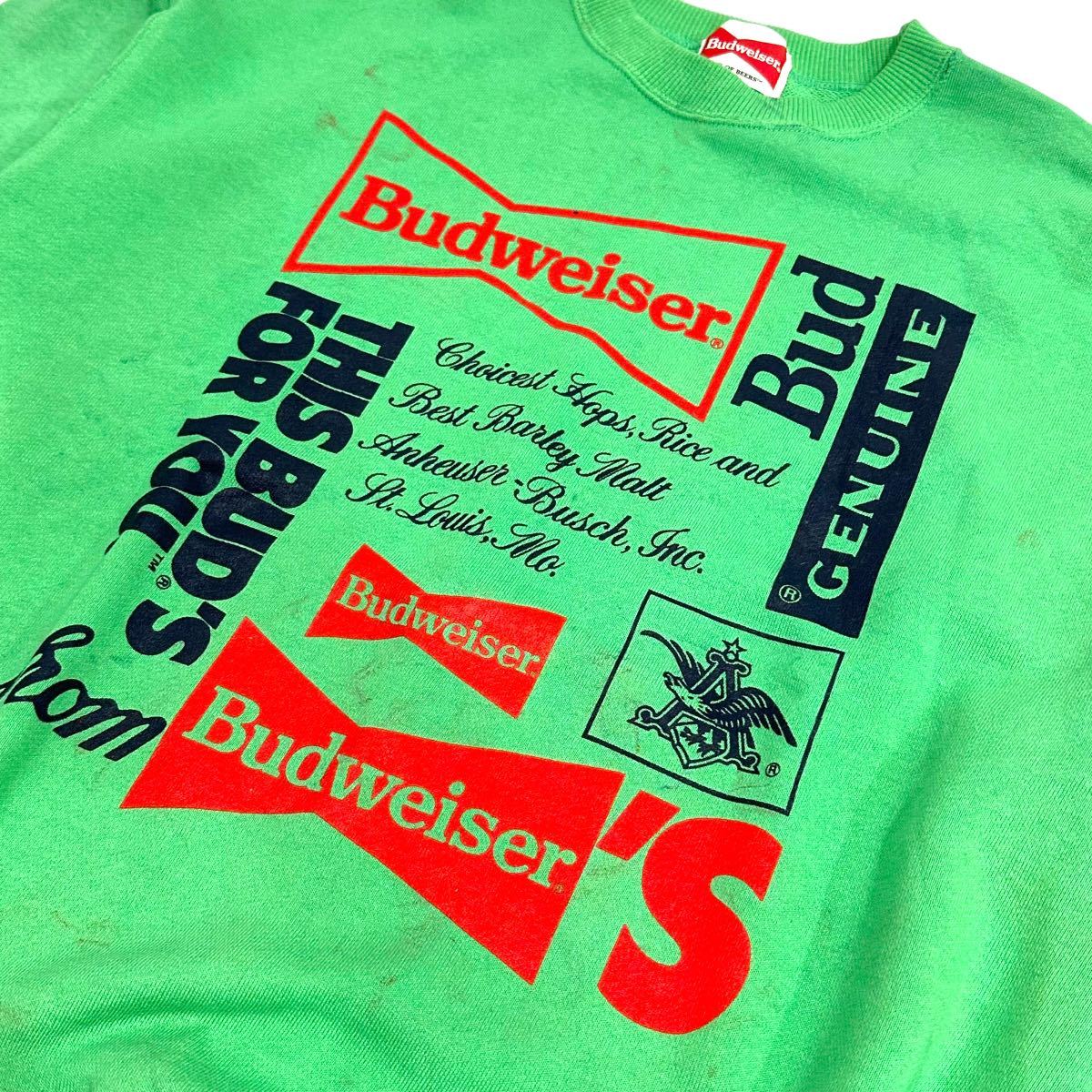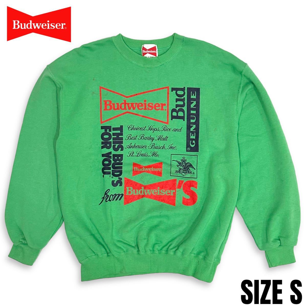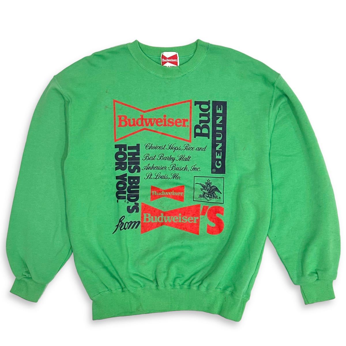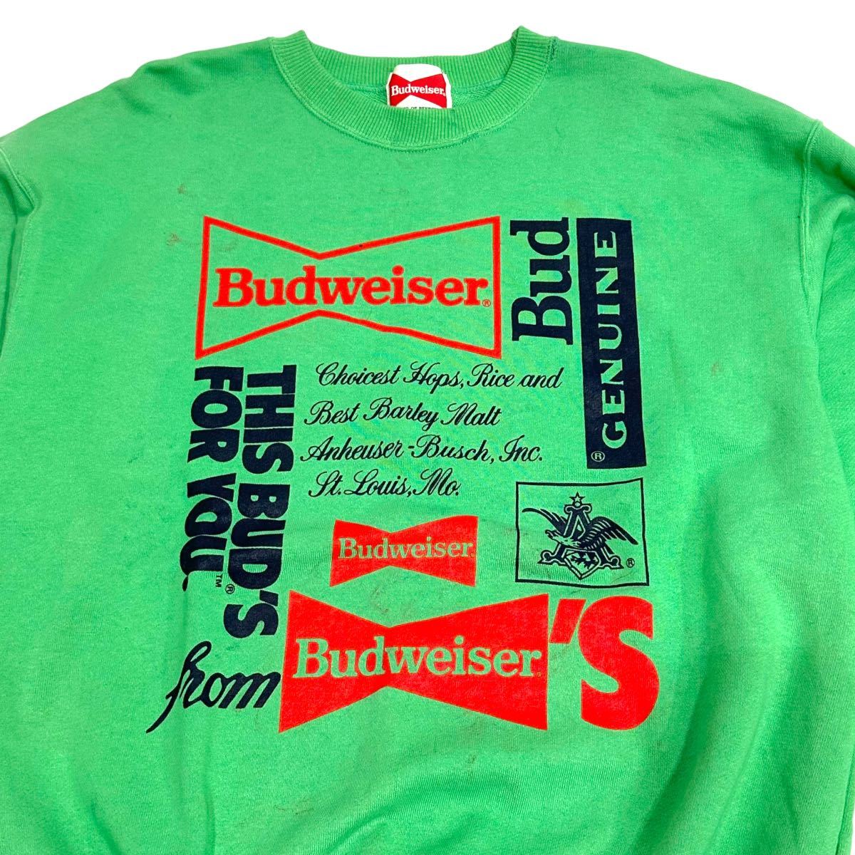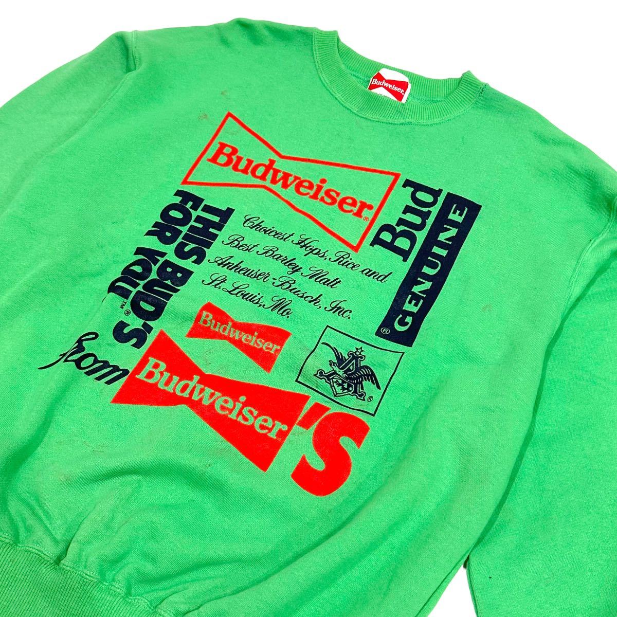 稀少■80~90’s Budweiser (バドワイザー) ロゴプリント ヴィンテージ 長袖 スウェット 緑 グリーン L アメカジ 古着 企業物 珍品