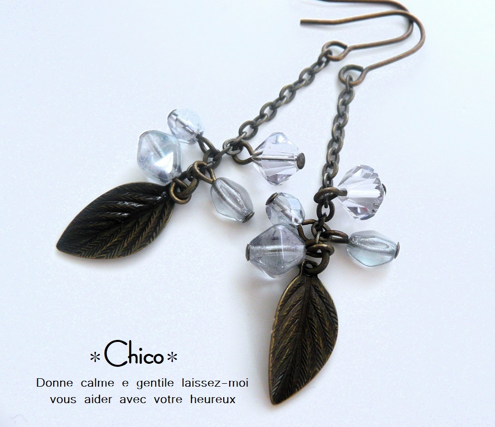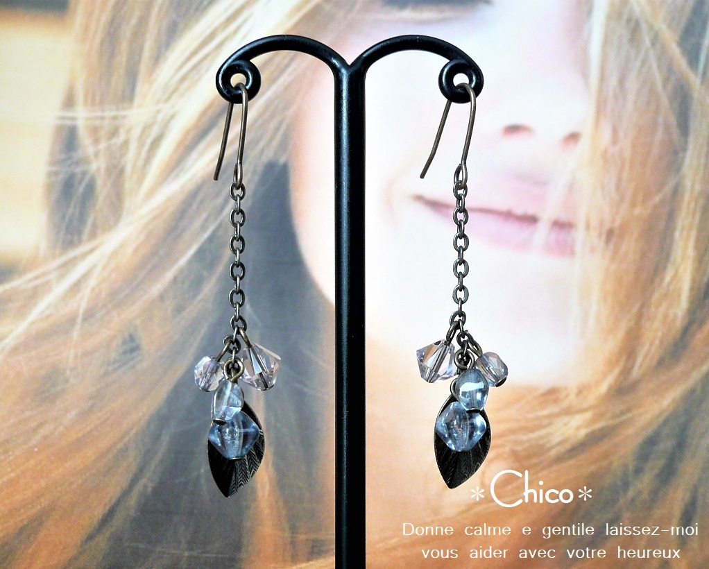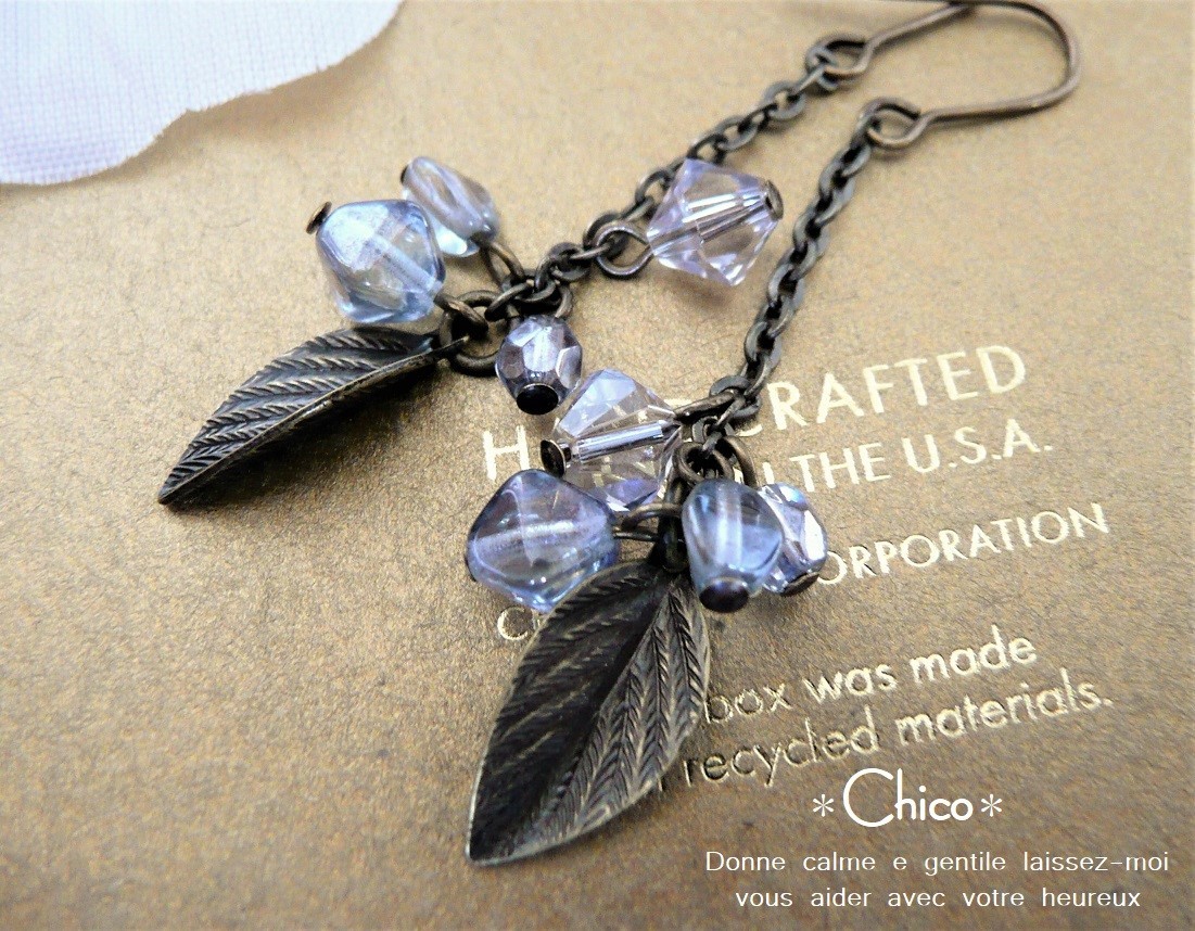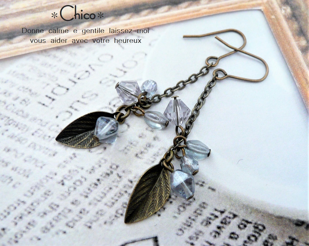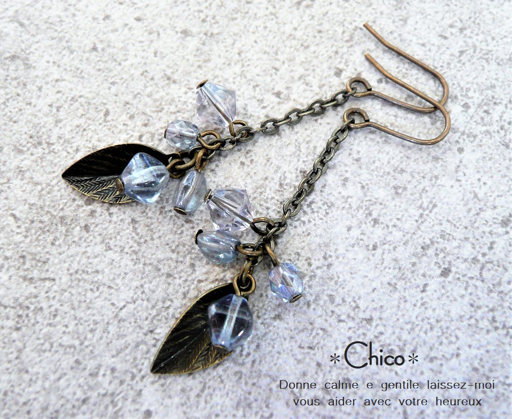 ■チェコ・スワロ ブルーetc 金古美リーフ&チェーン ハンドメイドピアス ♪ ★2点以上送料無料!★