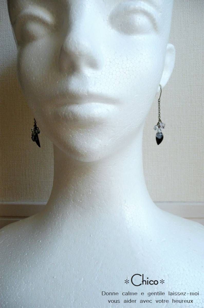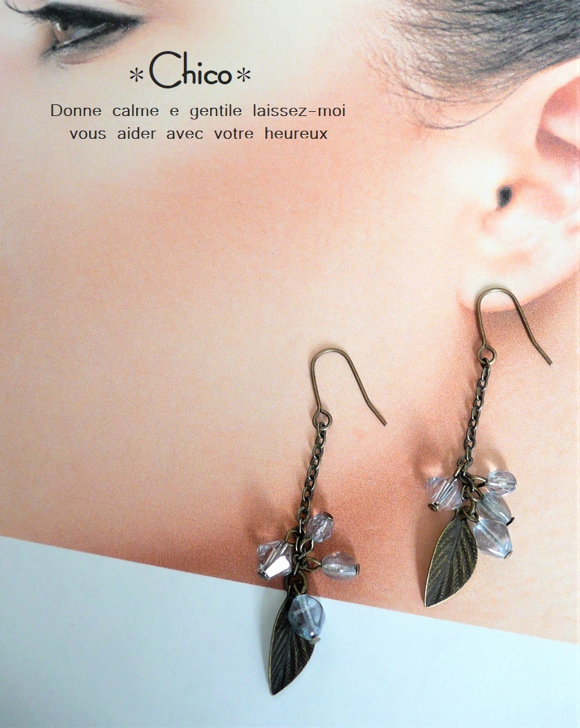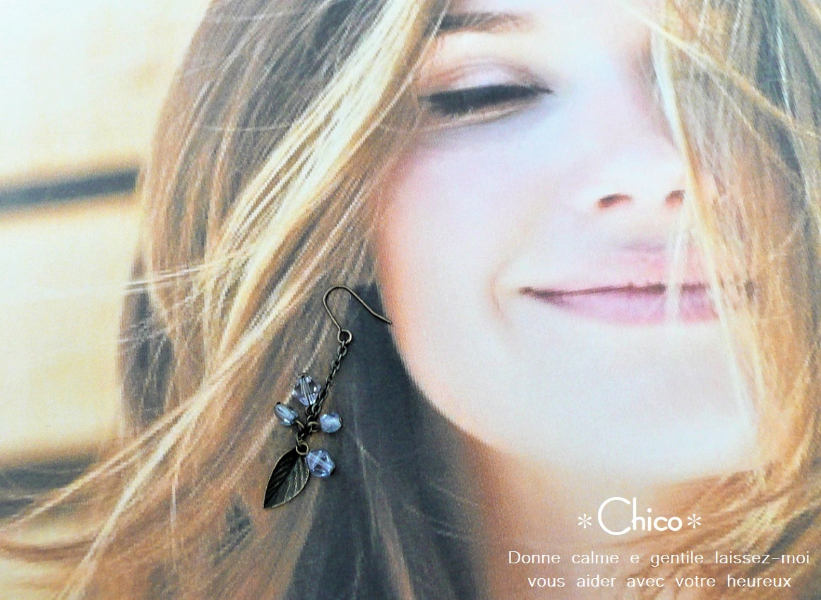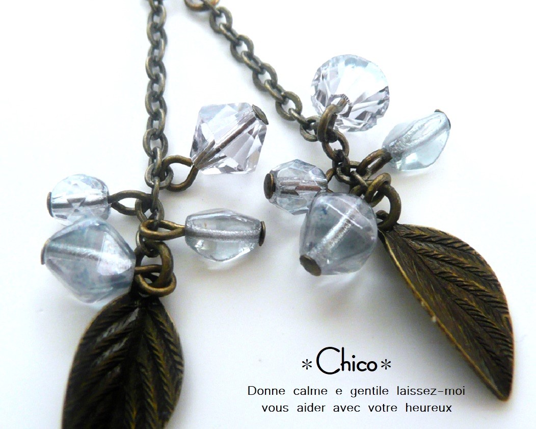 ■チェコ・スワロ ブルーetc 金古美リーフ&チェーン ハンドメイドピアス ♪ ★2点以上送料無料!★
