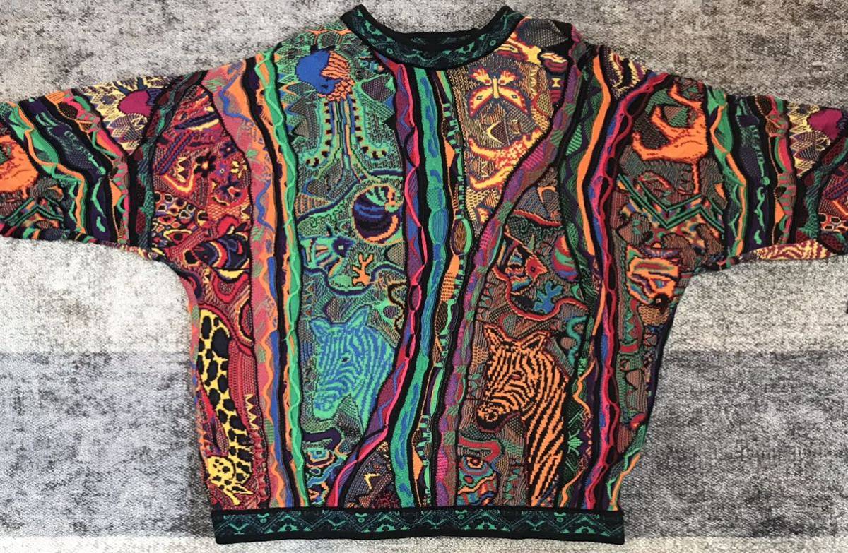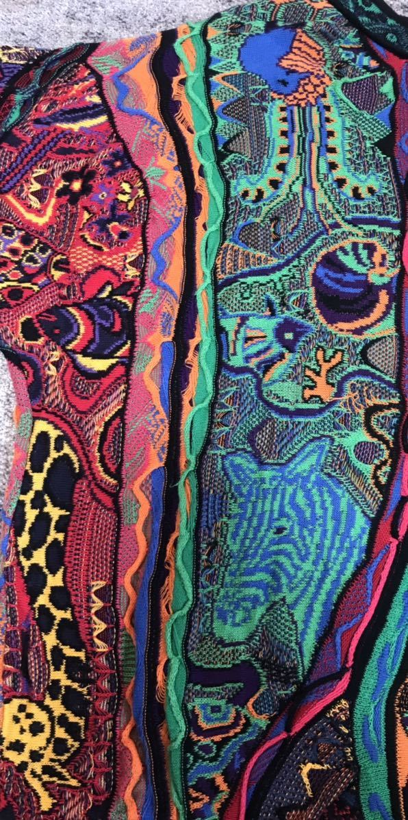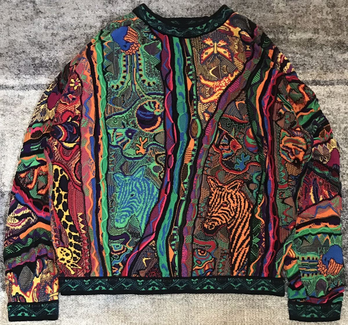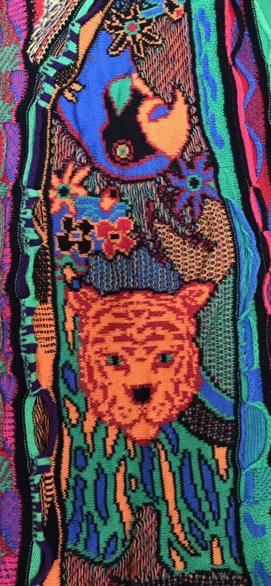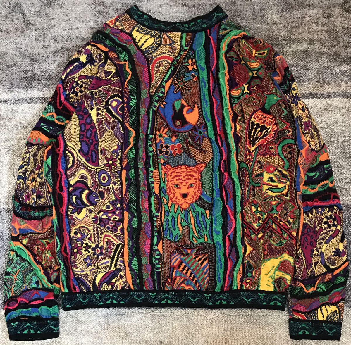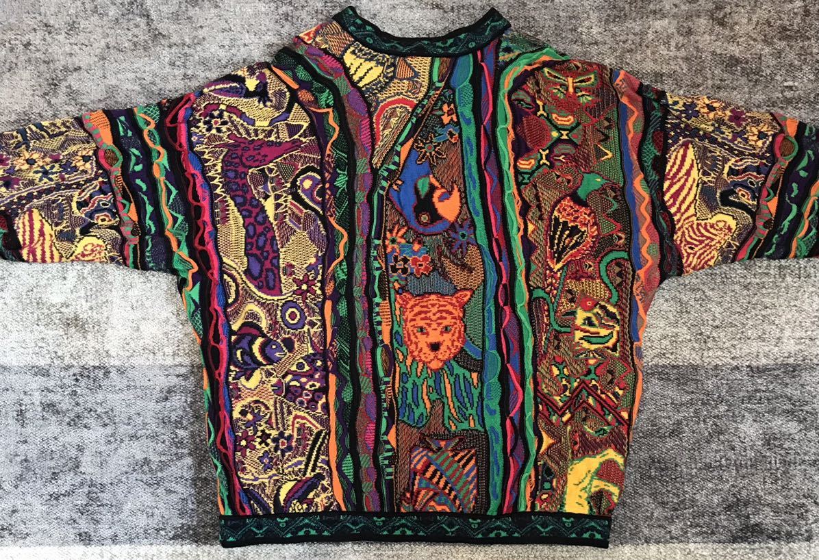 幻の逸品 最高傑作 異次元のセンス 90's vintage ★ COOGI AUSTRALIA ★ クージー オーストラリア アニマル柄 縞馬 シマウマ ゼブラ 麒麟柄 ジラフ 虎柄 寅 タイガー 鳥柄 バード柄 オウム柄 熱帯魚柄 フィッシュ柄 花柄 3D 立体 個性派 ド派手 カラフル コットン ニット セーター M です。